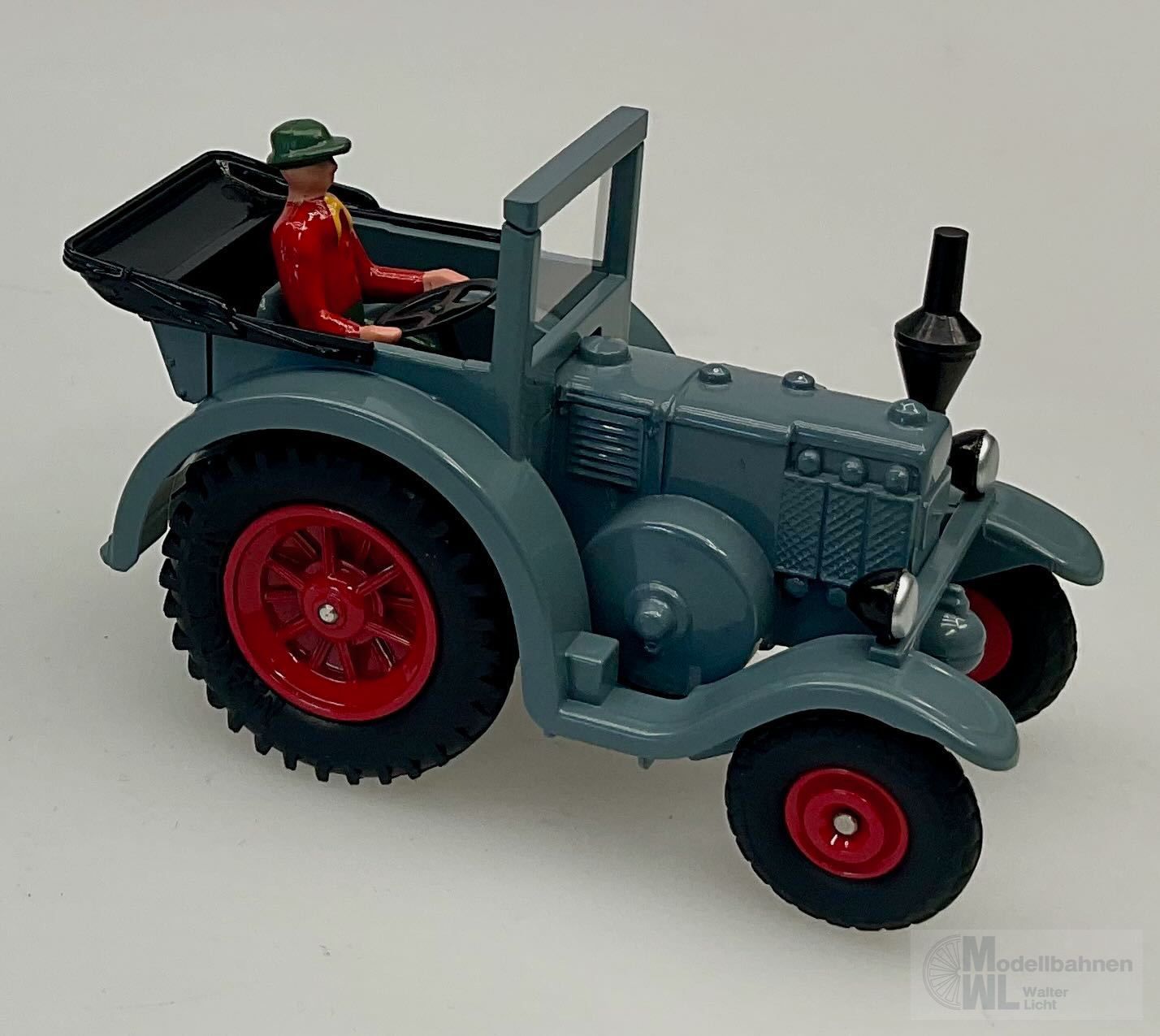 Modell: Weitgehende Neukonstruktion eines Lanz-Eilbulldogs mit Cabrioverdeck. Fahrzeug weitgehend aus Metall. Ausführung mit Fahrerfigur und Auspuff. Metallräder bestückt mit Gummireifen.