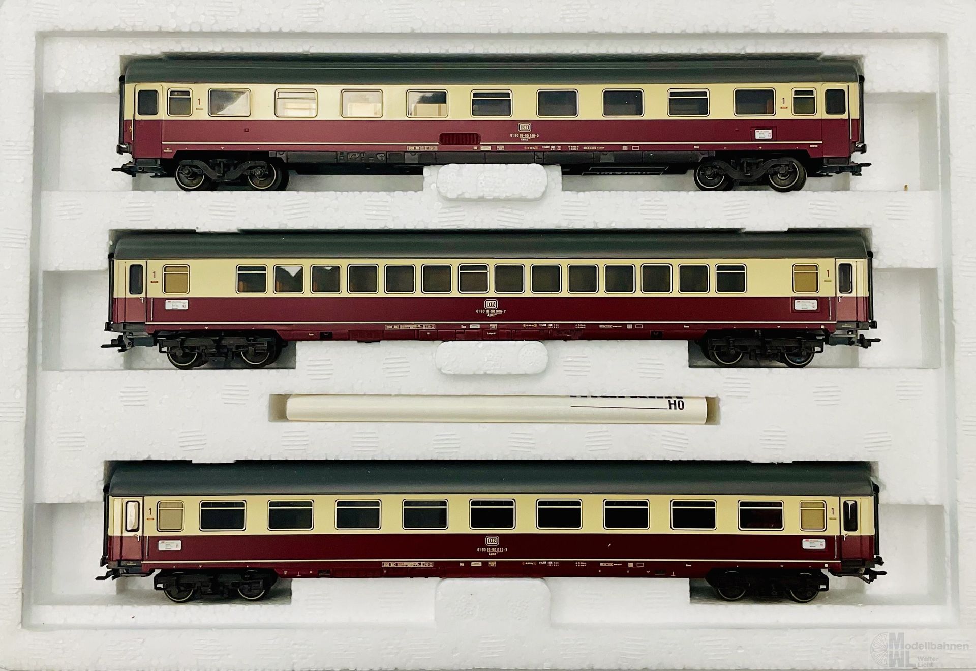 Modell: Verstellbare Puffer. Vorbereitet zur Strom führenden Wagenverbindung entweder mit steckbaren Kurzkupplungsdeichseln 7319 oder trennbaren Kurzkupplungen 72020/72021. Aufgedruckte Zuglaufschilder. Gesamtlänge über Puffer 80,8 cm.
