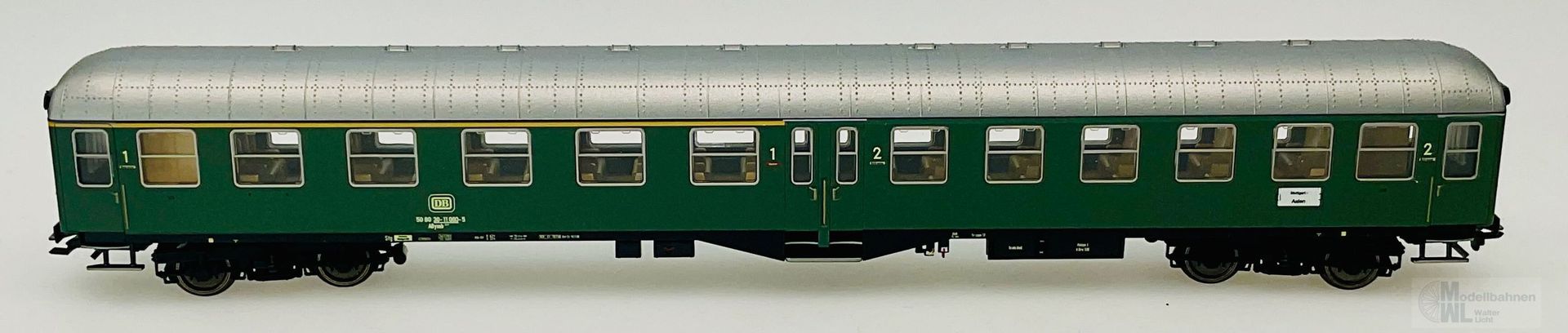 Modell: Serienmäßig eingebaute LED Innenbeleuchtung und Strom führende Kupplungen. Die Innenbeleuchtung funktioniert im Verbund mit dem Mitteleinstiegs-Steuerwagen und kann über einen Decoder im Steuerwagen digital ein- und ausgeschaltet werden. Stirnseitig rot transparente Schlusslicht-Einsätze an den Wagenenden. Typspezifisch gestalteter Unterboden. Drehgestelle Bauart Minden-Deutz schwer mit Doppelklotzbremse. Befahrbarer Mindestradius 360 mm. Für die Präsentation in einer Vitrine liegen WC-Fallrohre und Wendezugsteuerleitungen als separat ansteckbare Teile bei.