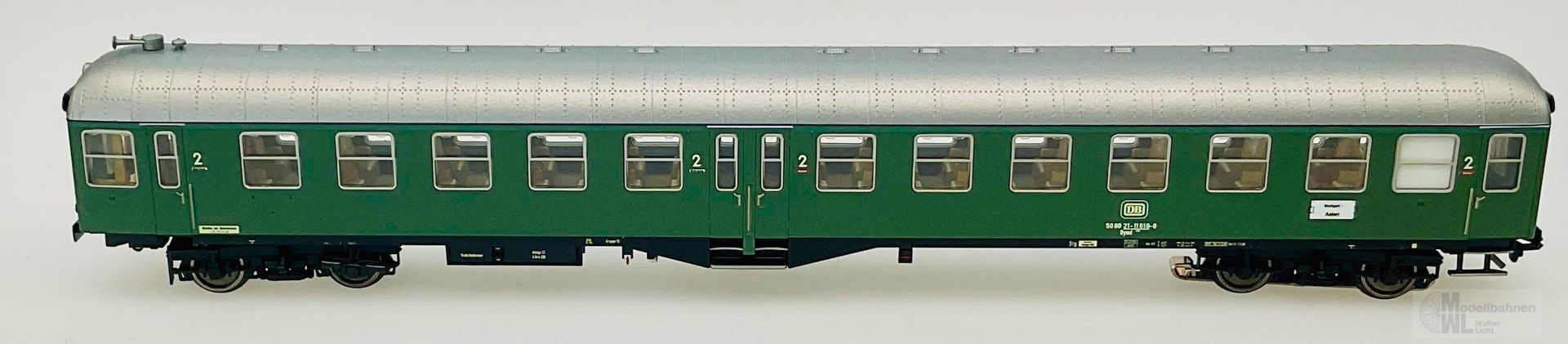 Modell: Mit Digital-Decoder mfx. Fahrtrichtungsabhängig wechselndes Dreilicht-Spitzensignal und zwei rote Schlusslichter konventionell an, digital schaltbar. Serienmäßig eingebaute LED-Innenbeleuchtung digital schaltbar. Führerstandbeleuchtung digital schaltbar. Strom führende Kupplung digital schaltbar. Typspezifisch gestalteter Unterboden. Stirnseitig rot transparente Schlusslicht-Einsätze am Wagenende ohne Führerstand. Drehgestelle Bauart Minden-Deutz schwer mit Doppelklotzbremse. Drehgestell vorne mit Schienenräumer, Sifa-Schaltkasten, Indusi und Generator D 62. Befahrbarer Mindestradius 360 mm. Für die Präsentation in einer Vitrine liegen ein WC-Fallrohr und eine Wendezugsteuerleitung als separat ansteckbare Teile bei. Länge über Puffer 28,2 cm.