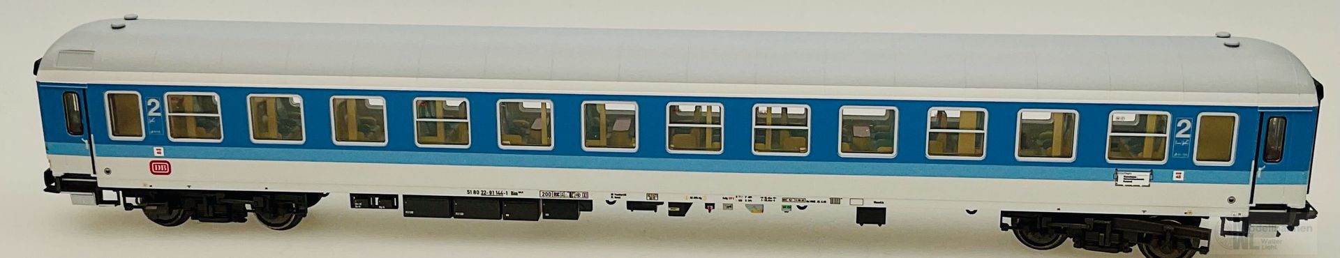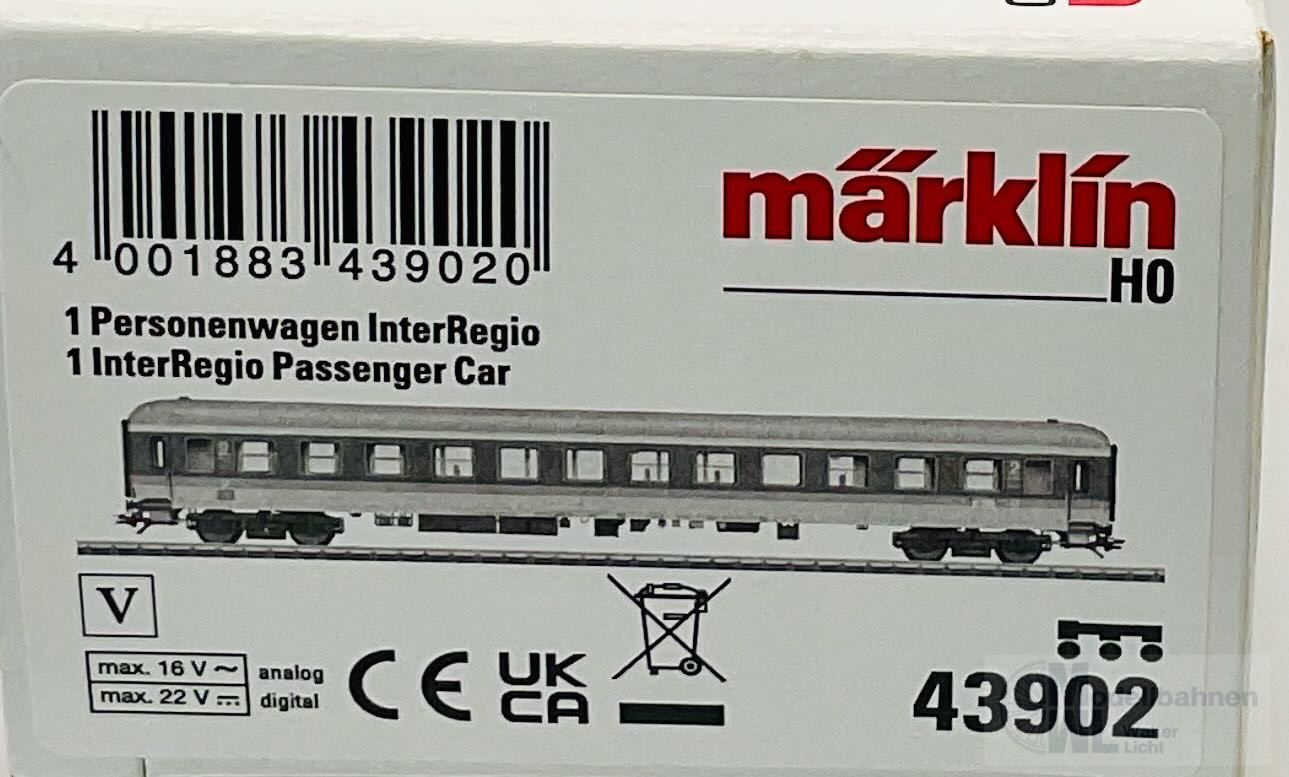 Modell: Komplette Neukonstruktion der InterRegio-Wagenfamilie. Mehrfarbige Inneneinrichtung. Serienmäßig eingebaute LED-Innenbeleuchtung mit Pufferkondensator zur Überbrückung von kurzfristigen stromlosen Stellen. Ausgestattet mit trennbaren, stromführenden Kurzkupplungen. Die Innenbeleuchtung funktioniert im Verbund mit dem Schlusslichtwagen aus dem Set 43901, die vorgegebene Fahrzeugreihenfolge ist dafür einzuhalten. Stirnseitig rot transparente Schlusslicht-Einsätze an den Wagenenden. Typspezifisch gestalteter Unterboden mit vielen angesetzten Details. Pufferhöhe nach NEM. Mit Drehgestellen MD 366 mit angesetztem Generator. Separat angesetzte Lüfter an den Wagenkästen. Aufgedruckte Wagenlaufschilder. Befahrbarer Mindestradius 360 mm. Länge über Puffer 28,2 cm.