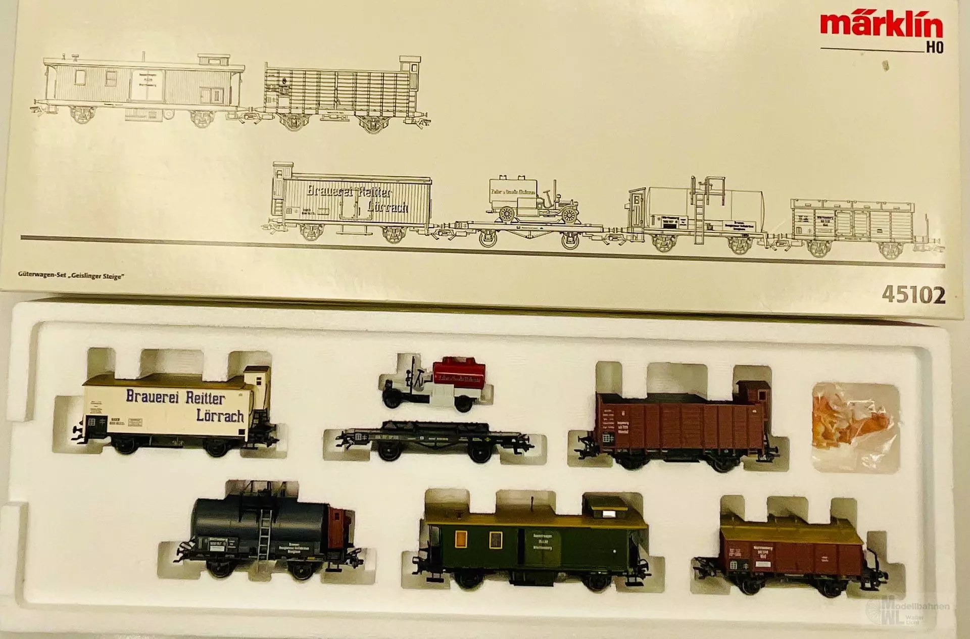Modell: 1 Viehwagen mit hochliegendem Bremserhaus. Mit 3 Kühen. 1 Güterzug-Begleitwagen mit Aussichtskanzel. Bewegliche Schiebetüren. 1 Bierkühlwagen. 1 Flachwagen, beladen mit Tank-Lkw. 1 Kesselwagen mit Bremserhaus. 1 Salzwagen mit Bremserbühne. Gesamtlänge über Puffer 67,0 cm. Gleichstromradsatz 2 x Trix 323600 09, 8 x 700630, 2 x 700320