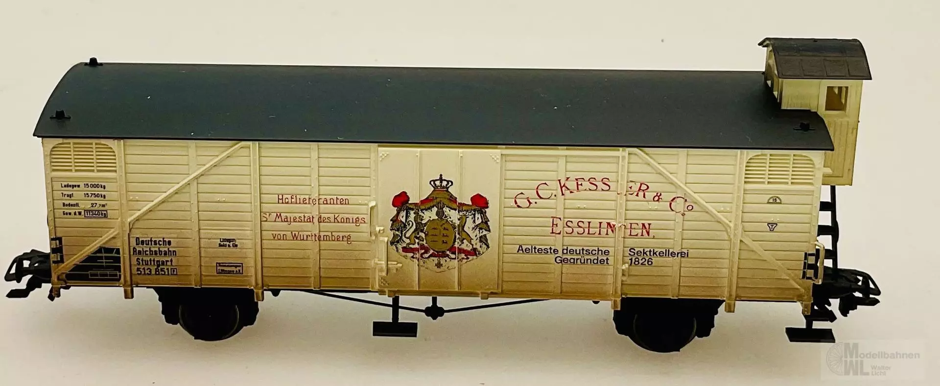 Modell: Mit angesetztem Bremserhaus, angesetzten Aufstiegsleitern und Handläufen. Der Wagen ist leicht gealtert. Länge über Puffer 13,3 cm.