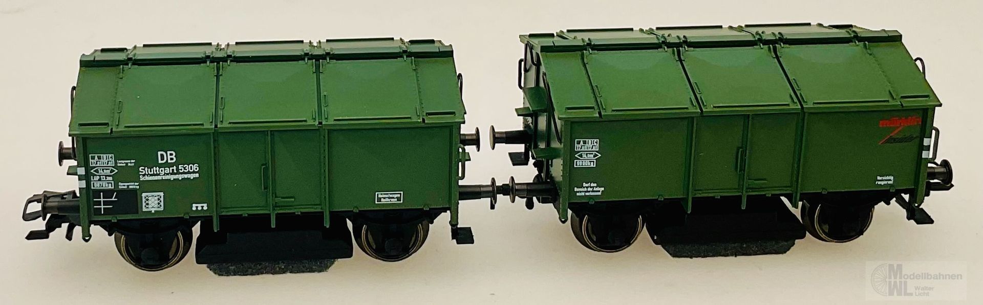 Modell: Beide Wagen mit angebauter Schienenreinigungseinrichtung. Je ein vertikal beweglicher Metallblock mit parallel eingesetzten Reinigungsflächen aus Polierfilz. Reinigungsflächen austauschbar und waschbar. Klappdeckel zum Öffnen. Kurzkupplungen mit Kulissenführung. Beide Wagen mit Steckkupplung verbunden. Länge über Puffer 15,3 cm.