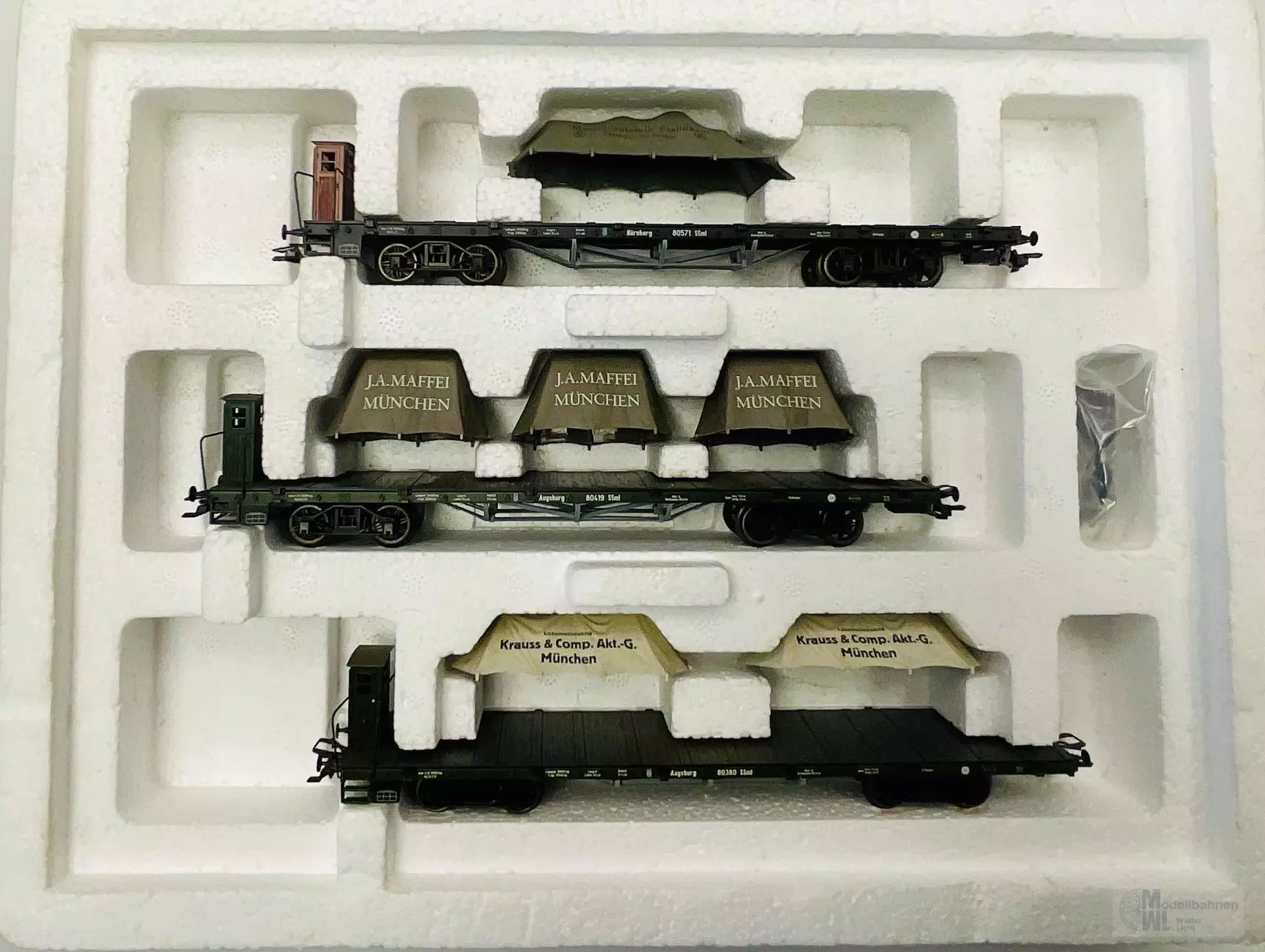 Modell: Ausführung mit Bremserhaus. Jeweils unterschiedliche Betriebsnummern. Rungen und Planen abnehmbar. Filigrane Nachbildung der Fachwerkdrehgestelle und des Sprengwerks. Doppelspeichenräder. Gesamtlänge 59,3 cm. Gleichstromradsatz 206852.