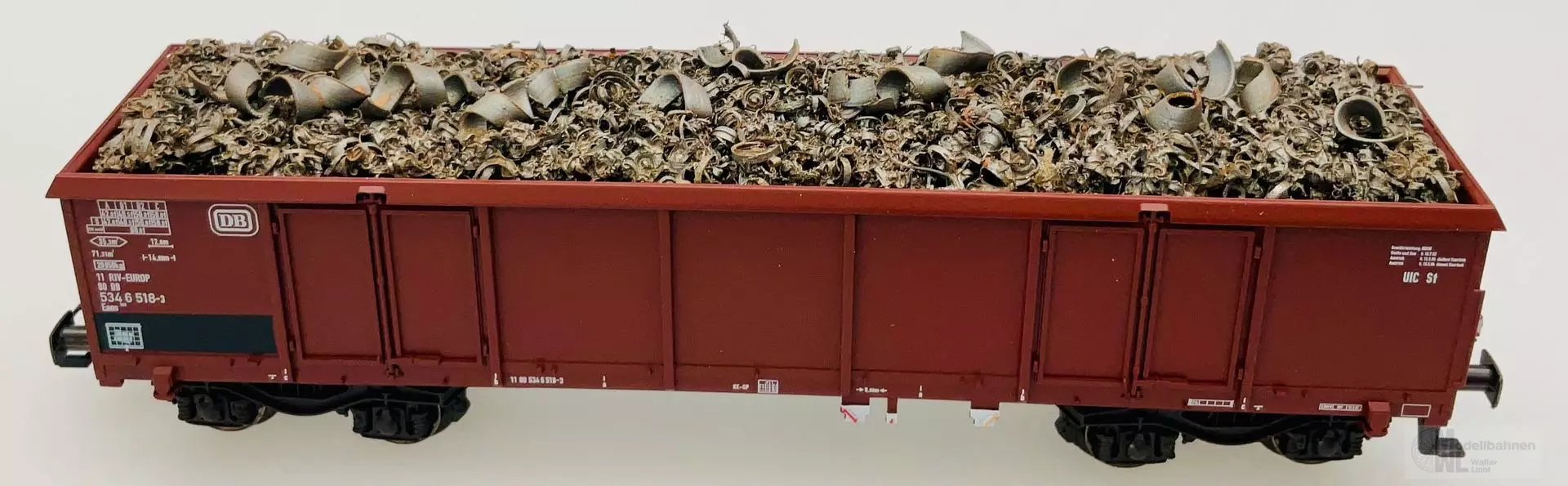 Model: Mit mfx-Decoder und Geräuschfunktionen. Serienmäßig eingebautes LED-Schlusslicht, digital schaltbar. Schleifer montiert. Drehgestelle Y25 geschweißt. Ladungseinsatz zur Darstellung von Schrott. Länge über Puffer ca. 16,1 cm.
