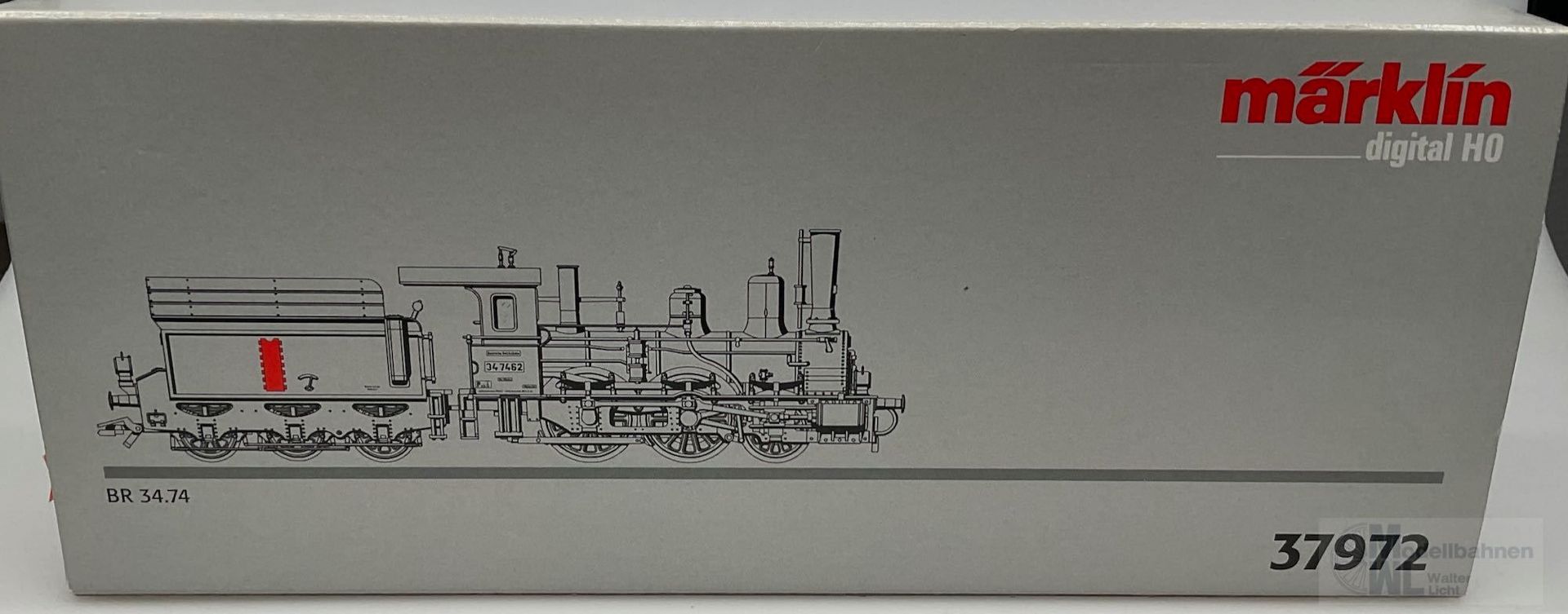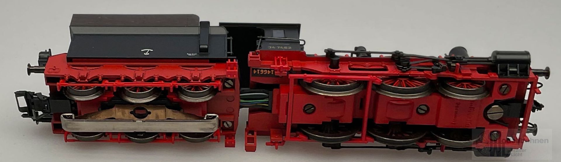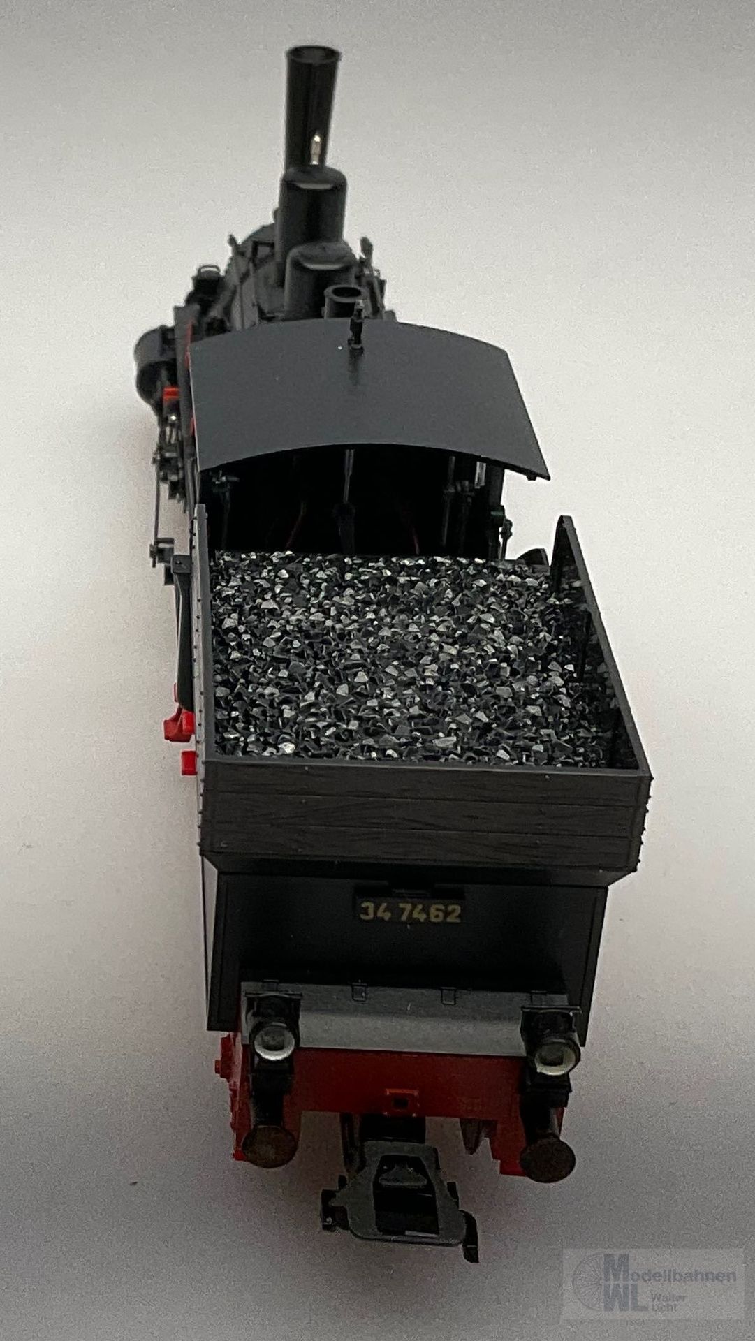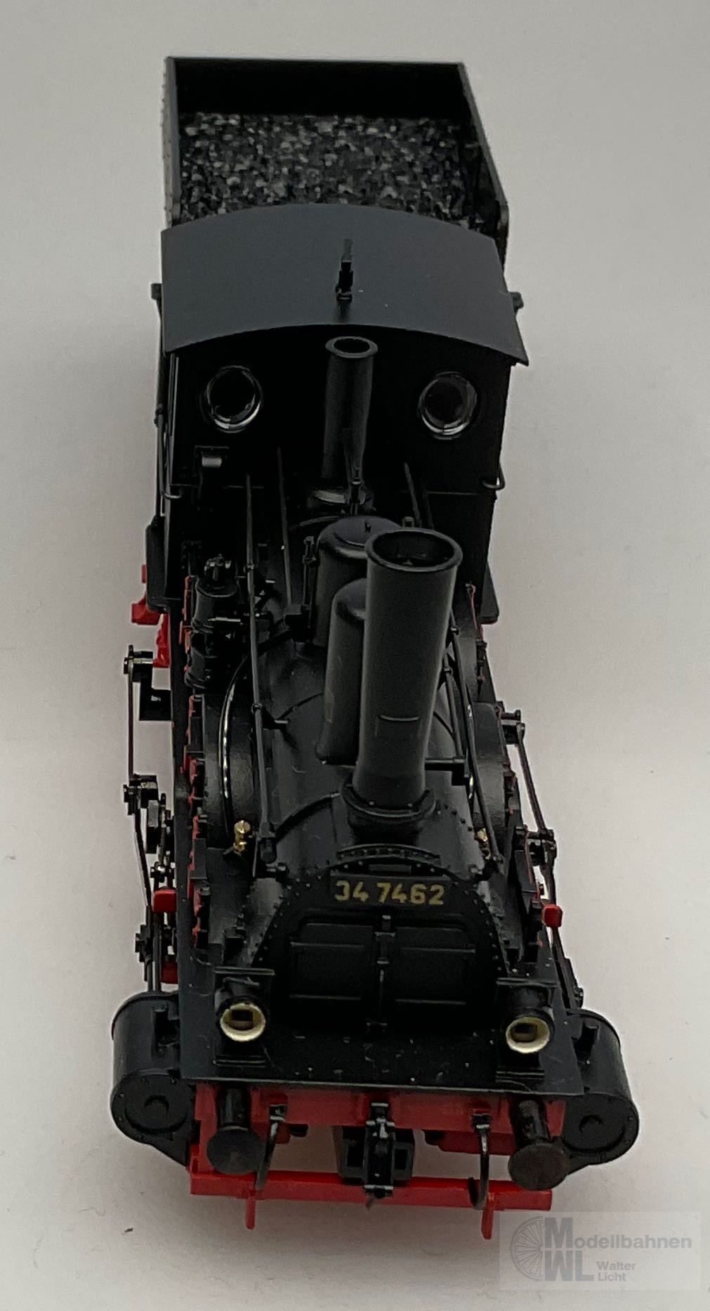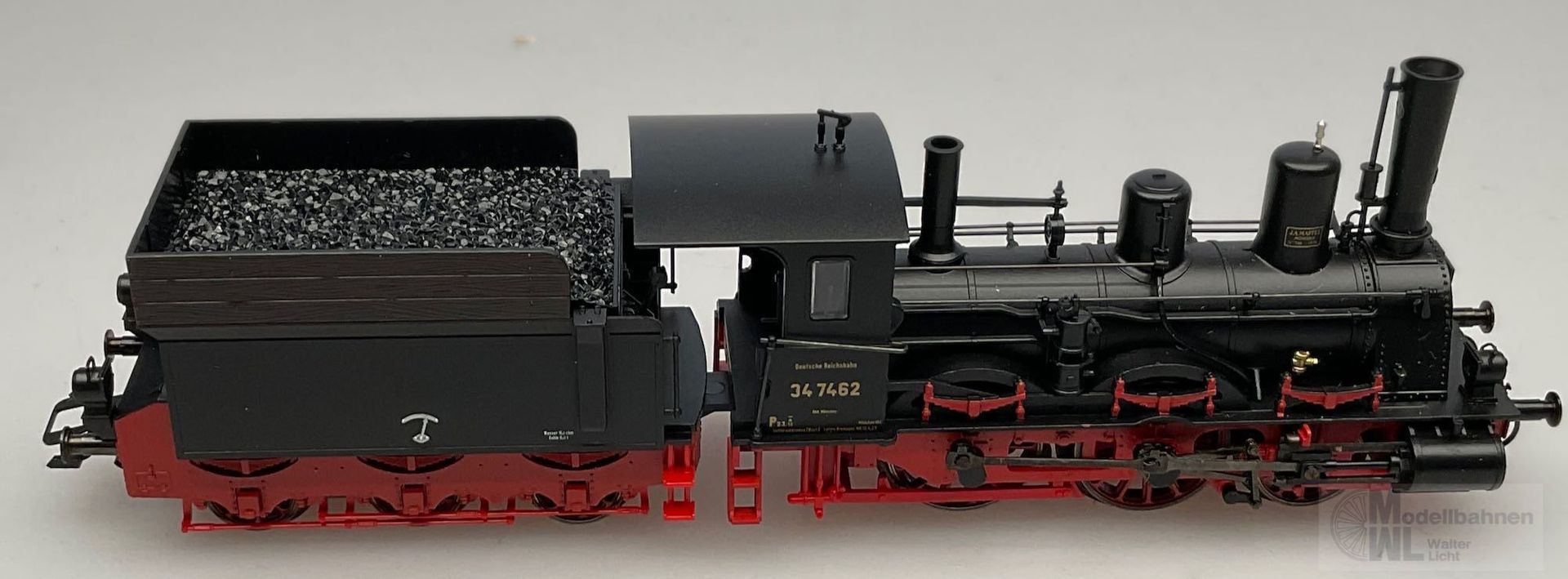 Modell: Mit Digital-Decoder und einstellbarem Hochleistungsantrieb. Spitzensignal und Strom führende Kupplung digital schaltbar. Hochleistungsmotor mit Glockenanker. 2 Achsen angetrieben. 4 Haftreifen. Detailliertes Fahrwerk mit Außenrahmen und Stephenson-Steuerung. Feste Kurzkupplung zwischen Lokomotive und Tender. Norm-Kupplungsaufnahme am Tender mit elektrischem Anschluss zur Wagenbeleuchtung.