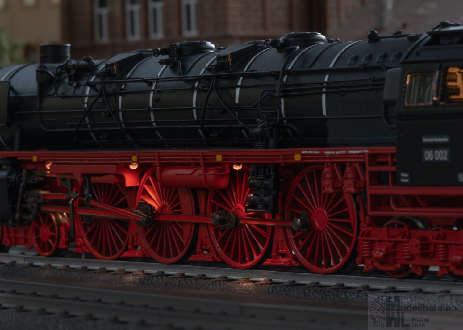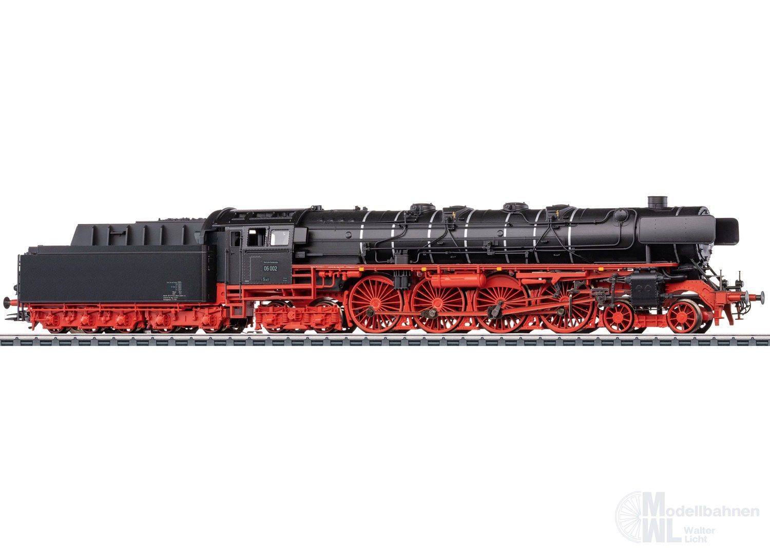 Vorbild: Schnellzug-Dampflokomotive 06 002 der Deutschen Bundesbahn (DB). In fiktiver Ausführung ohne Stromlinienverkleidung, mit Kohlen-Schlepptender 2´3 T38, Zweilicht-Spitzensignal, Witte-Windleitbleche und einseitiger Indusi. Heimatbetriebswerk Hamm. Betriebszustand 1952.