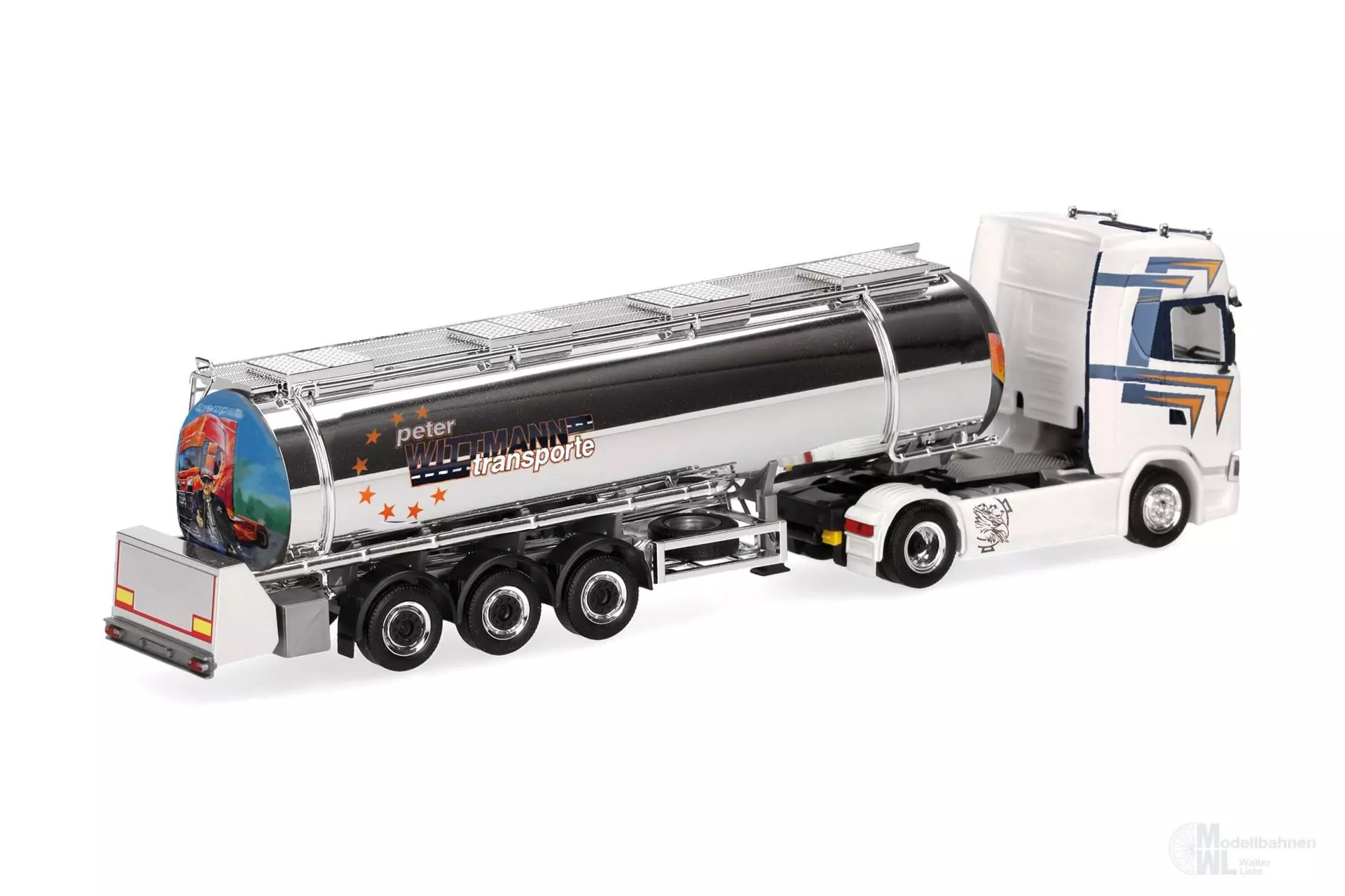 The Wittmann Transporte freight forwarding company is based in Kammerstein in Middle Franconia. The company was founded back in 1901 and now operates over 40 semi-trailers internationally. In addition to refrigerated trucks, the fleet also includes 12 tank semi-trailers for food transport. This chrome tank semi-trailer is dedicated to Scania tuner Svempas with a motif on the rear.