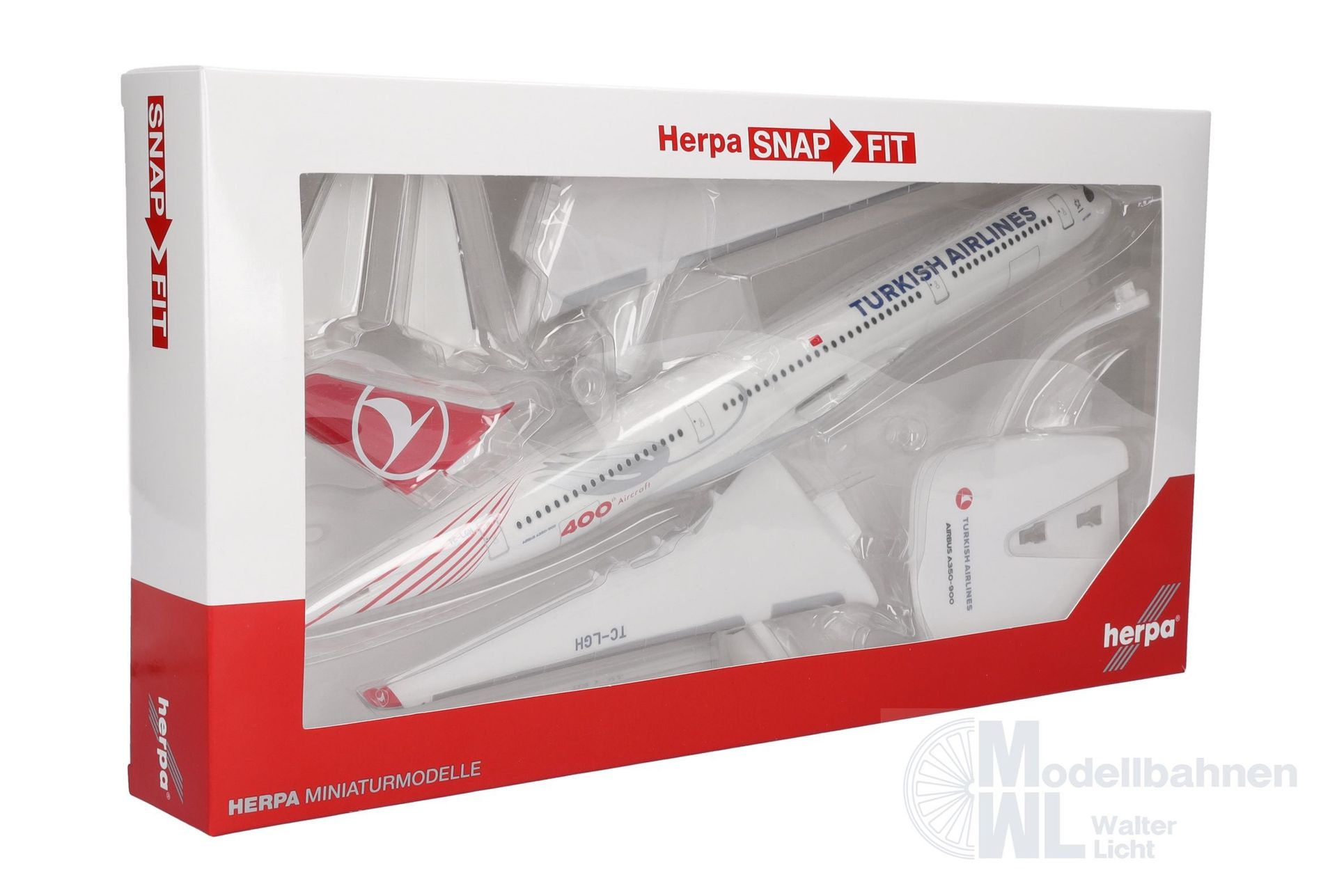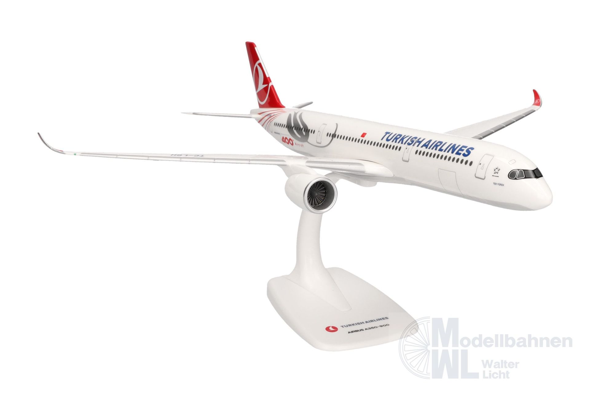 2016 hatte Turkish Airlines ihr 300. Flugzeug übernommen. Nur sieben Jahre später konnte die Airline mit Auslieferung dieser A350 ihr inzwischen 400. Flugzeug in der Flotte begrüßen. Dieser Meilenstein wurde mit einer Sonderbemalung gebührend gefeiert. Auch der Name und der Einsatz des Flugzeugs mit der Kennung TC-LGH sind außergewöhnlich: Am 4. März 2023 absolvierte es einen Sonderflug für die Familien, die aus der von der Erdbebenkatastrophe stark betroffenen Provinz Hatay im Süden der Türkei evakuiert wurden. "Tek Yürek", zu Deutsch "Ein Herz", soll den Zusammenhalt nach dieser Katastrophe symbolisieren. SnapFit-Modelle von Herpa überzeugen mit einem unschlagbaren Preis-/Leistungsverhältnis. Sie werden mit einem Display-Stand geliefert und sind mit wenigen Handgriffen ohne Kleber oder sonstige Werkzeuge zusammengebaut.