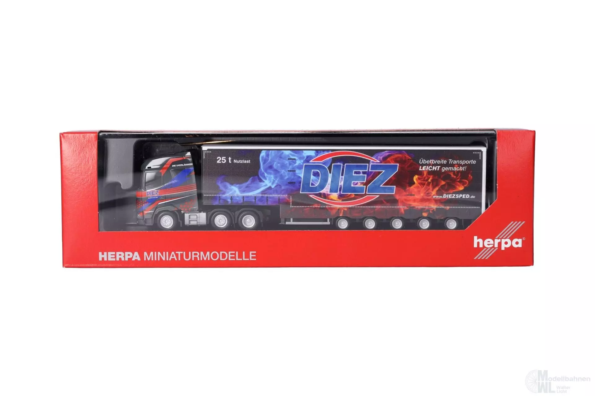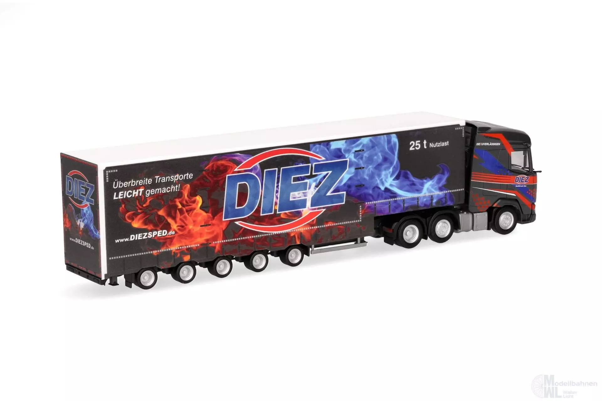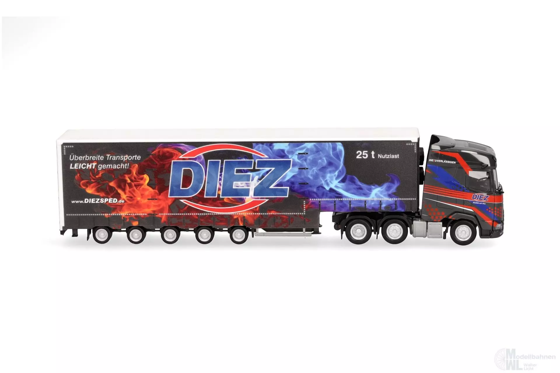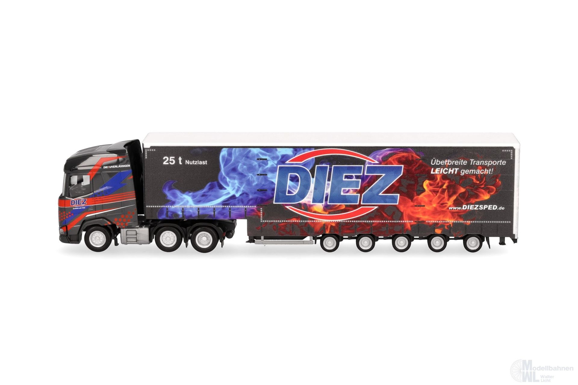 Diez aus dem badenwürrtembergischen Dettingen, fährt Transporte meist unter Plane, die aber in Ihrer Art sehr unterschiedlich sein können. Vom normalen Gardinenplanenauflieger bis hin zu 5achsigen Semitiefladern ist alles im Einsatz um eine große Bandbreite abzudecken. Der 3achsige DAF XG zieht einen 5achsigen Planenauflieger. Das Modell erschein in einmaliger Auflage.