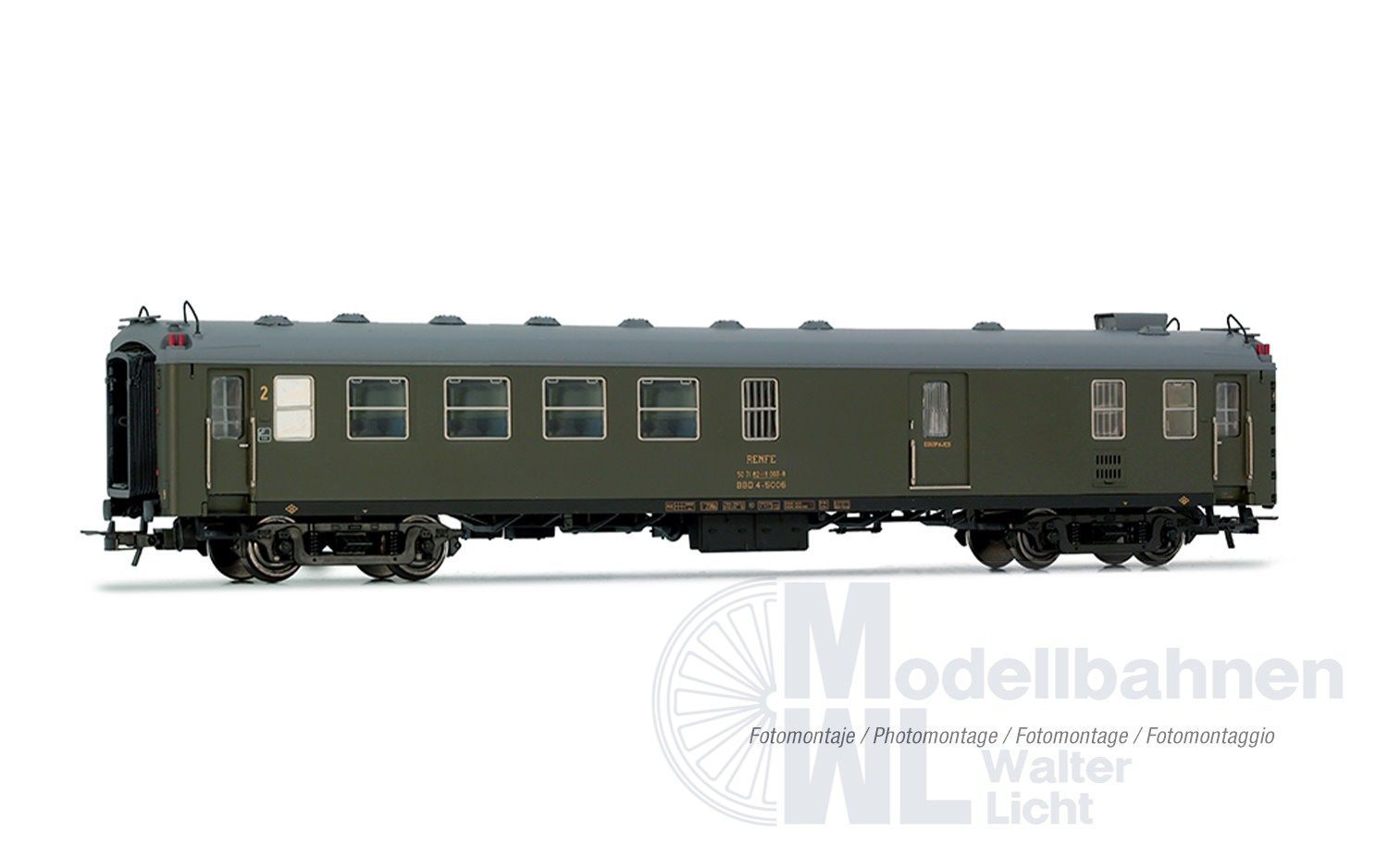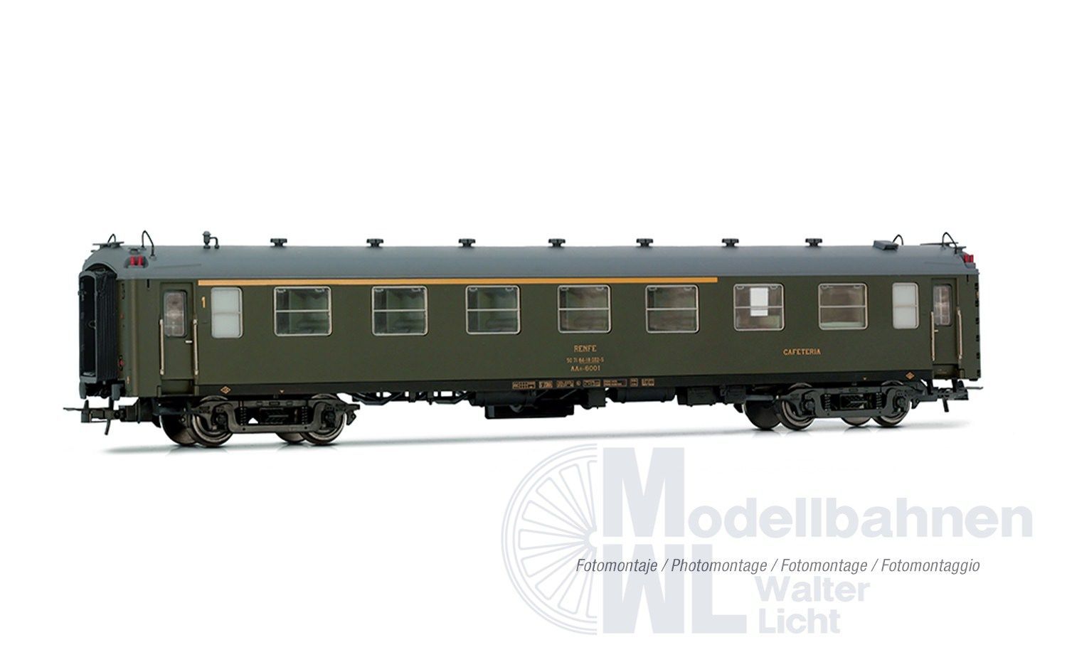RENFE, 2-tlg. Set Reisezugwagen 5000, 1 x BBD4 Gepäckwagen + 1 x AAR Barwagen, mit Faltenbälgen, olivgrüne Farbgebung