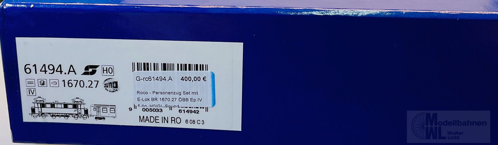 Produktinformationen "Roco 61494 - Roco - Personenzug Set mit E-Lok BR 1670.27 ÖBB Ep.IV 5.tlg. H0/GL Sound"