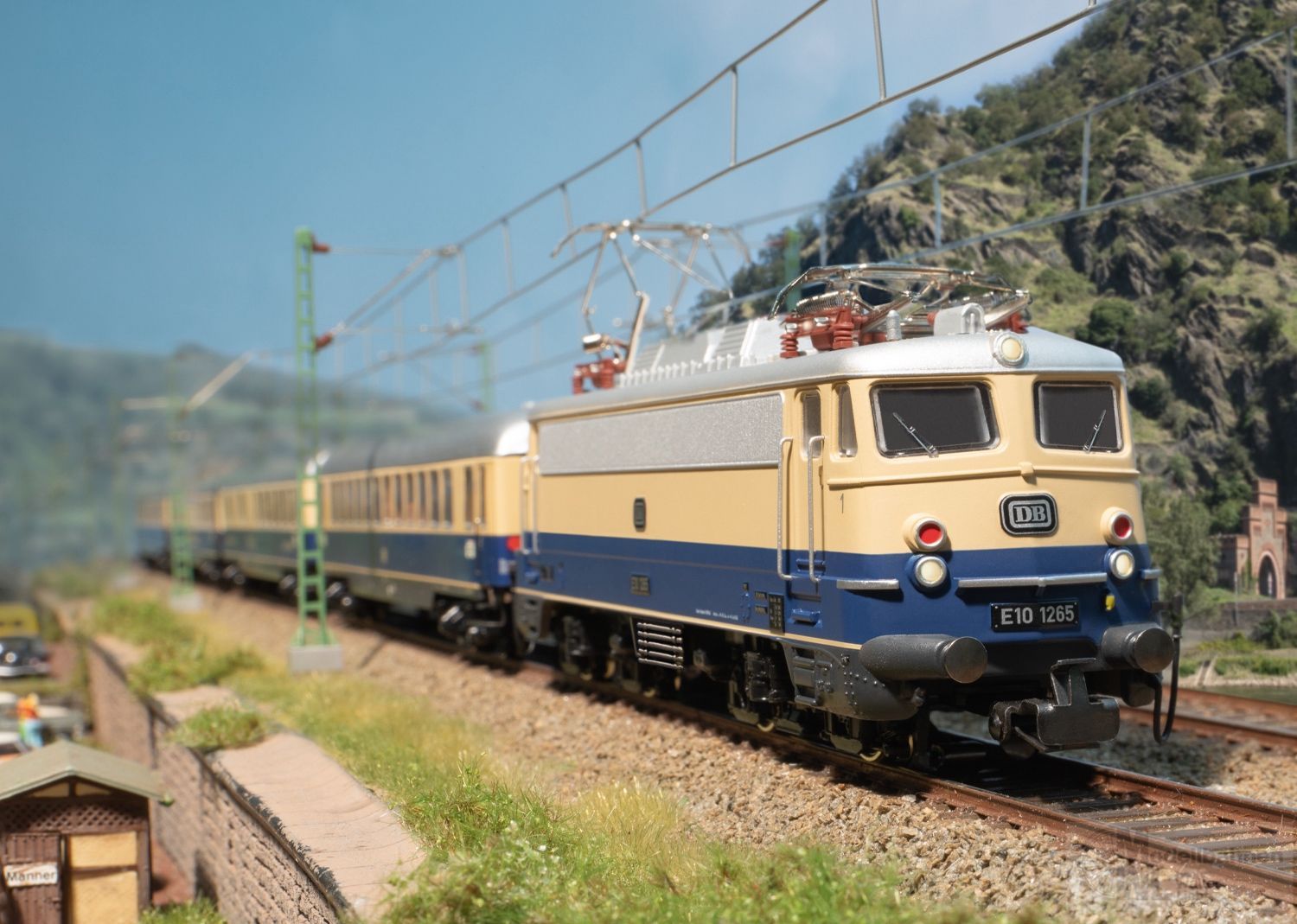 Vorbild: Elektrolokomotive Baureihe E10.12 "Bügelfalte" der Deutschen Bundesbahn (DB). Kobaltblau/beige Grundfarbgebung, als Rheingold-Lokomotive. Ausführung mit 5 Stirnlampen, durchgehendem Lüfterband mit abgerundeten Enden, umlaufender Regenrinne sowie Pufferverkleidung und Schürze. Lok-Betriebsnummer E10 1265. Betriebszustand um 1962/63.