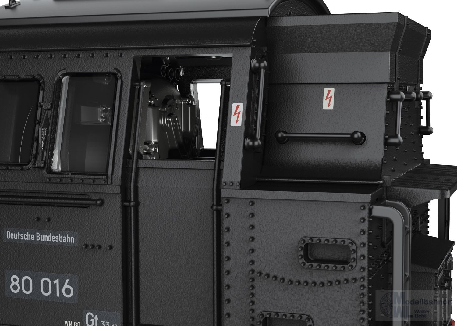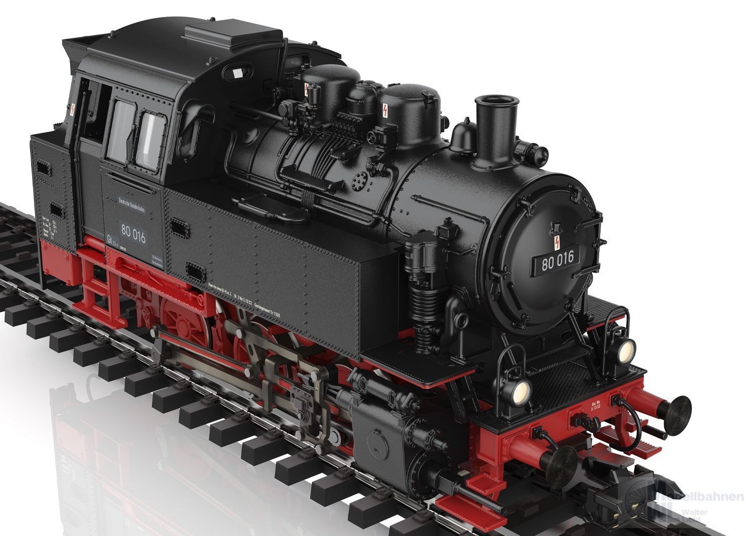 Vorbild: Tenderlokomotive Baureihe 80 der Deutschen Bundesbahn. Ausführung mit drei Kesselaufbauten, Läutewerk und Turbodynamo links, Rauchkammertüre ohne Zentralverschluss mit Nummernschild mittig. Tiefschwarze Grundfarbgebung. Betriebsnummer 80 016. Betriebszustand um 1953.