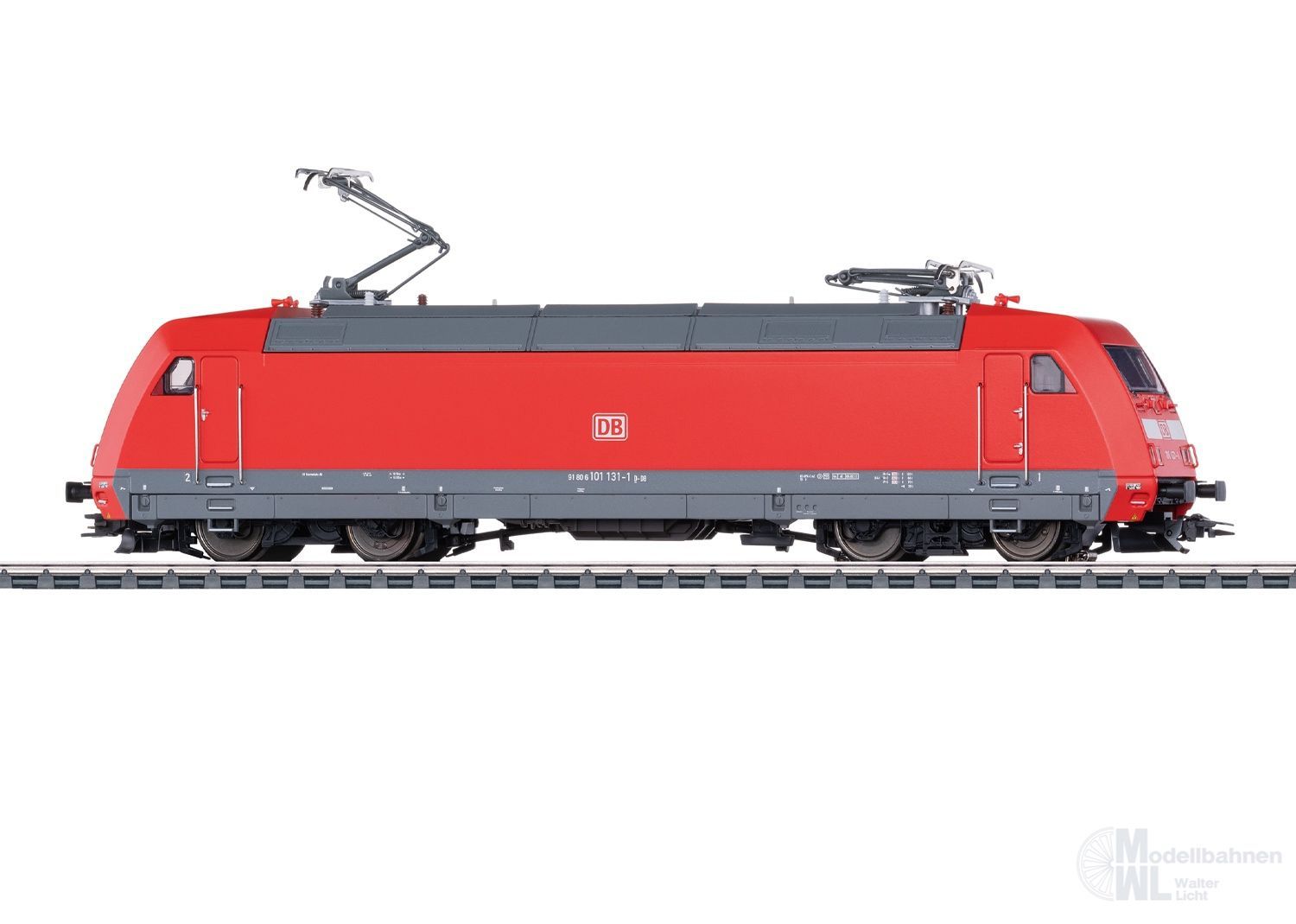 Vorbild: Schnellzuglokomotive Baureihe 101 der Deutschen Bahn AG (DB AG). Farbgebung in Verkehrsrot, als Zuglokomotive für die ICE-Schnellzugwagen der ehemaligen Metropolitan-Reisezugwagen (MET). Lok-Betriebsnummer 101 131-1. Betriebszustand um 2015.