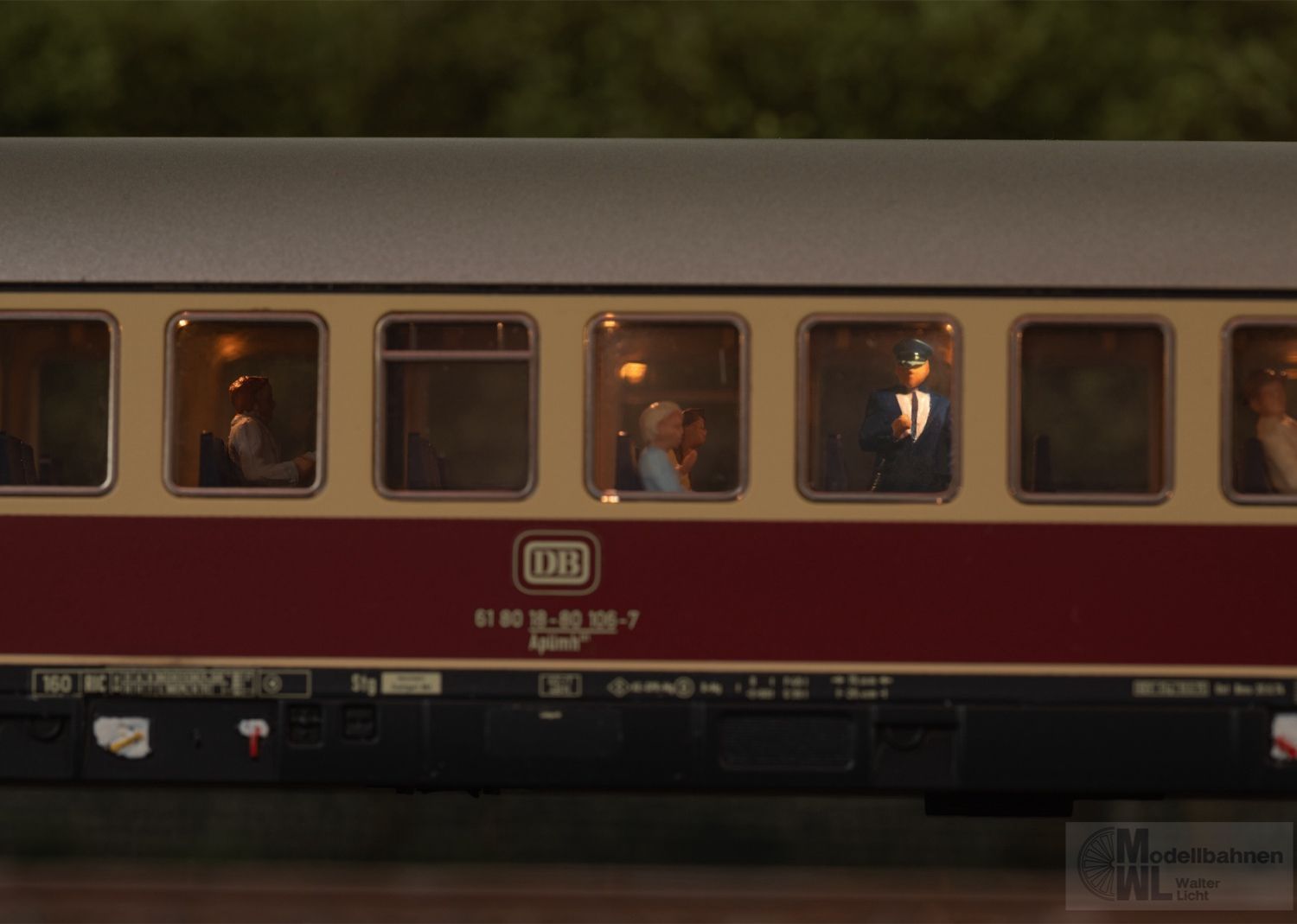 Modell: Mit Digital-Decoder mfx. Mit beweglicher, digital schaltbarer Schaffnerfigur im Mittelgang. Serienmäßig eingebaute LED-Innenbeleuchtung, trennbare stromführende Kupplungen und Zugschlussbeleuchtung am Wagenende 1 und 2 jeweils separat digital schaltbar. Beleuchtung mit wartungsfreien Leuchtdioden (LED). Mit Pufferspeicher. Schleifer ist montiert. Typspezifisch gestalteter Unterboden und Schürze. Mit Drehgestellen nach Bauart Minden-Deutz schwer, vorbildentsprechend mit Scheibenbremsen, Magnetschienenbremse und angesetzten Generatoren. Inneneinrichtung mit Figuren. Gesamtlänge über Puffer 28,2 cm.