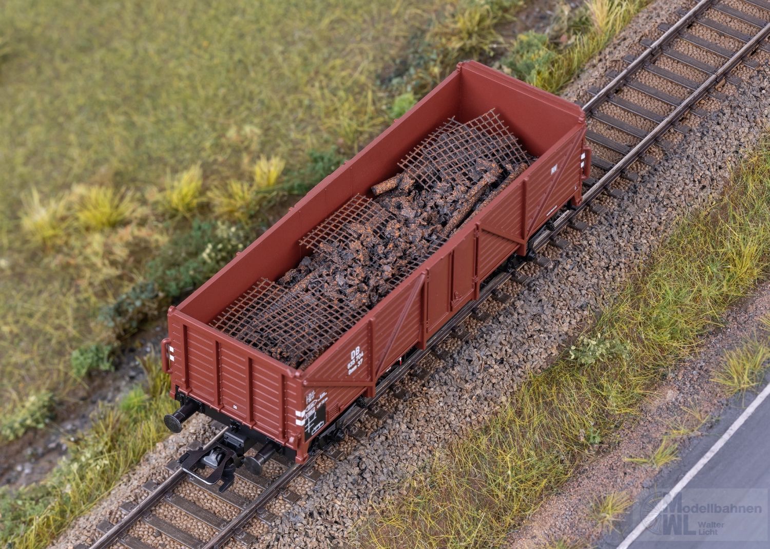 Vorbild: Offener Hochbordwagen der Bauart Omm 37 der Deutschen Bundesbahn (DB). Rotbraune Grundfarbgebung. Betriebszustand ab Mitte der 1950er-Jahre.