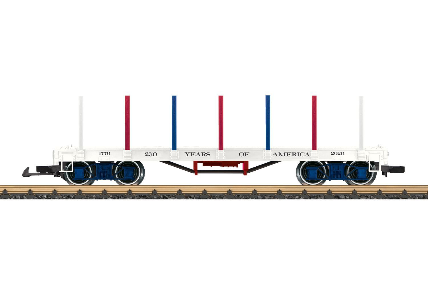 2026 wiederholt sich die Unterzeichnung der Unabhängigkeitserklärung in Amerika. Zu diesem Jubiläum bringt LGB ein Sonderwagen heraus. Flachwagen in den US-Farben gestaltet. Wagenboden aufwendig mit verschiedenen Bilder zum Thema Unabhänigkeit bedruckt. Passende Beladung der Liberty Bell. Beiligende Rungen in den US-Farben. Metallradsätze.