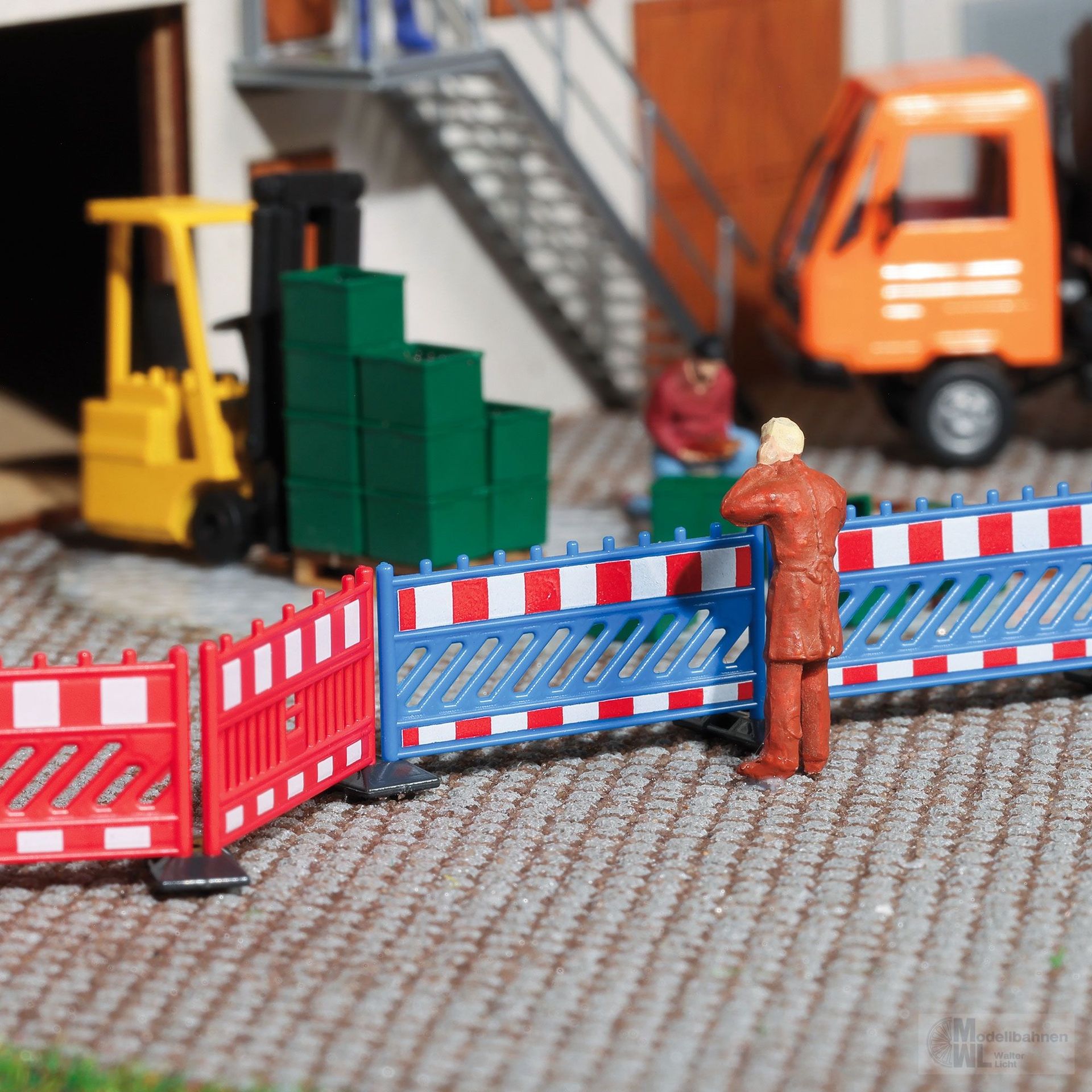 Bausatz für eine vorbildgetreue, mobile Baustellenabsicherung. Inhalt: 16 Absperrschrankengitter (8 x blau, 8 x rot) sowie 32 Fußplatten zur stabilen Aufstellung. Größe je 24 x 12 mm. Gesamtlänge über 380 mm.