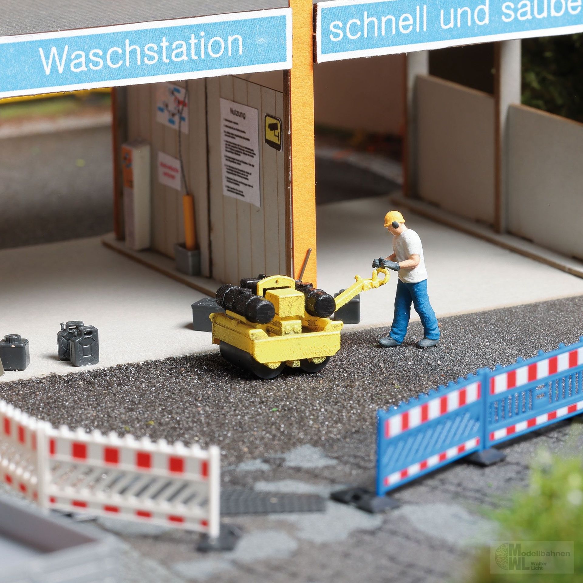 Ein Bauarbeiter führt eine kompakte Walze über die Baustelle und bereitet den Untergrund präzise vor. Moderne Absperrgitter und Lochbleche sichern den Arbeitsbereich, Werkzeug und Kanister stehen griffbereit zur Seite. Das detailreiche Action Set eignet sich ideal für Darstellungen der Epochen 5 und 6.