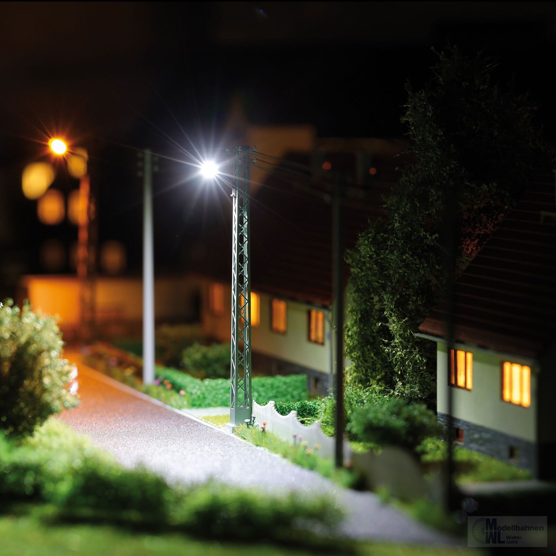Typische Industrieleuchte, wie sie seit den 1960er Jahren in der DDR eingesetzt wurde und auch heute noch weit verbreitet ist. Filigrane Ausführung vom Gittermast aus Metall und den Isolatoren am oberen Mast. Die ovale Leuchtenform stellt das Modell einer häufig eingesetzten Leuchtentype aus der Fertigung des ehemaligen VEB Leuchtenbau Leipzig (LBL) dar. Das weiße Licht wurde im Original durch Quecksilberdampflampen erzeugt und wird hier im Modell durch weiße Neon-LEDs vorbildlich wiedergegeben. Der Gittermast kann mit weiteren Leuchtkörpern aus dem Set H0 TT 4153 bestückt werden. Fertigmodell.