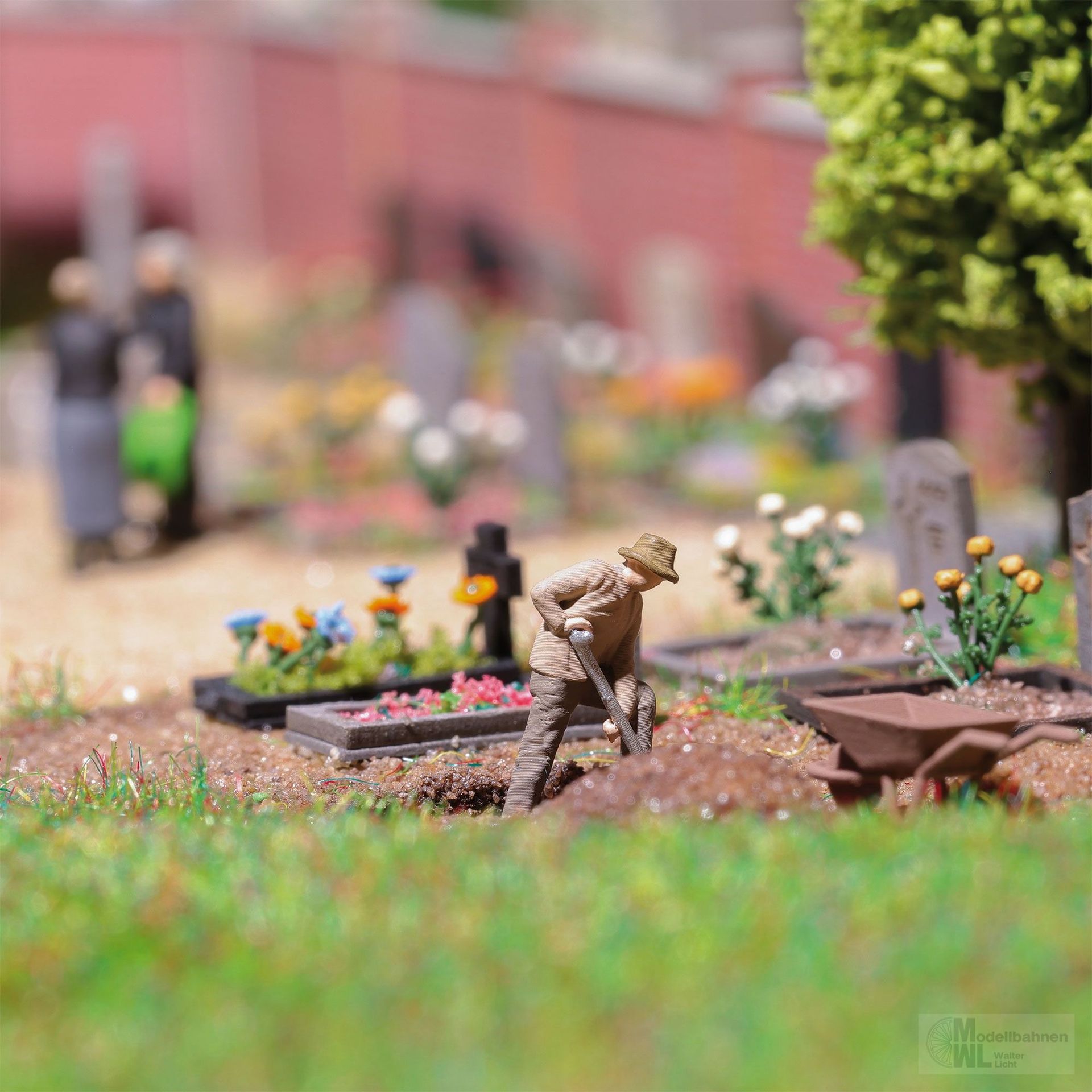 Der große Erdhügel weist darauf hin, dass der Totengräber bereits ein tiefes Erdloch ausgegraben hat. Inklusive Schubkarren, Besen, Schaufel und Eimer. Action Set.