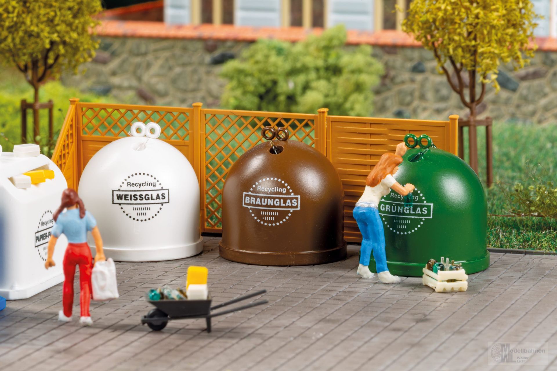 Kleiner Bausatz, der auf der Anlage schnell eine typische Alltagsecke entstehen lässt. Mit Sichtschutzzaun, 2 Papier-Containern und 3 Flaschen-Containern. Papierbündel sowie Flaschen in verschiedenen Farben liegen ebenfalls bei.
