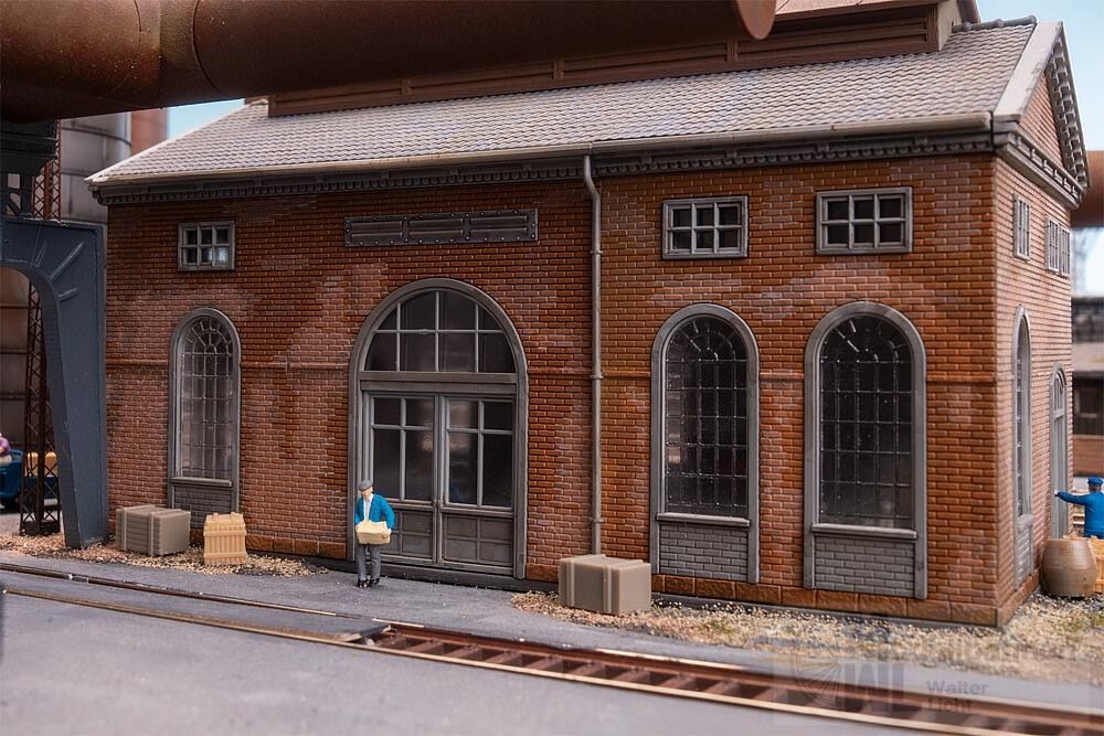 Dieses Miniaturmodell eines Backsteingebäudes mit Hochtank und ausgearbeiteten Rohrleitungen bildet in der Realität ein zentrales Element der Gichtgasreinigung in Hüttenwerken. Die industrielle Szenerie lässt sich mit dem separat erhältlichen Rohrleitungs-Set (Art. 180328) noch weiter ausbauen – für ein realistisches Gesamtbild im Hüttenwerksbetrieb. Das Modell ist abgestimmt auf das Modell des Meidericher Hochofens.