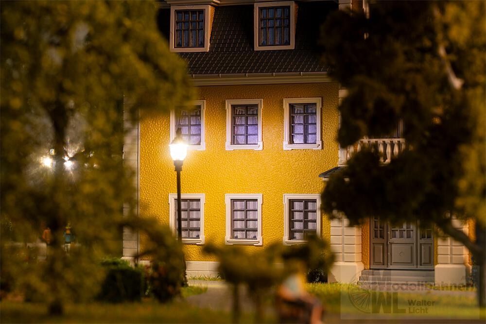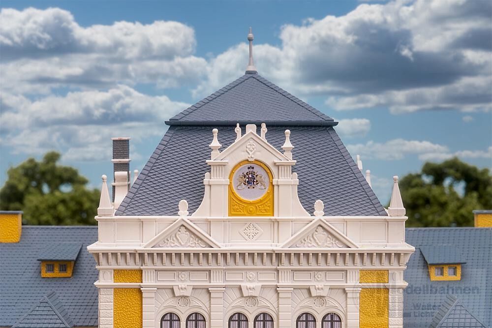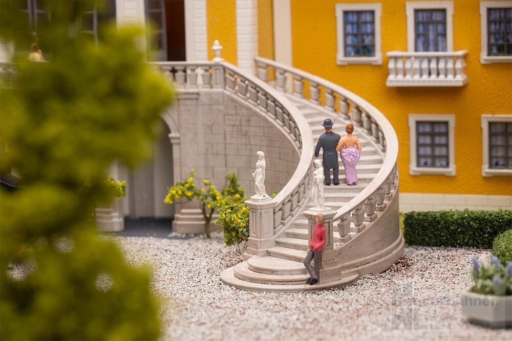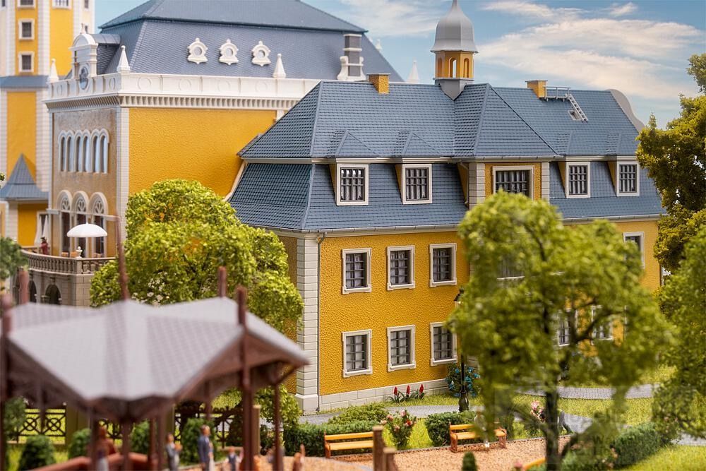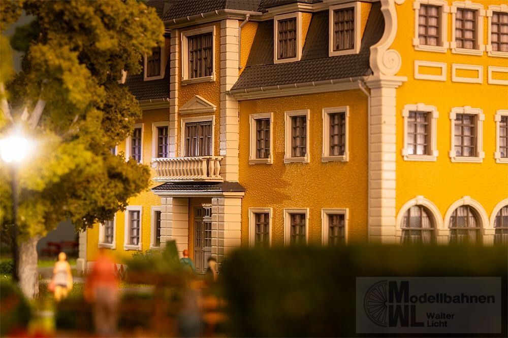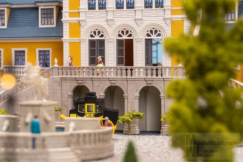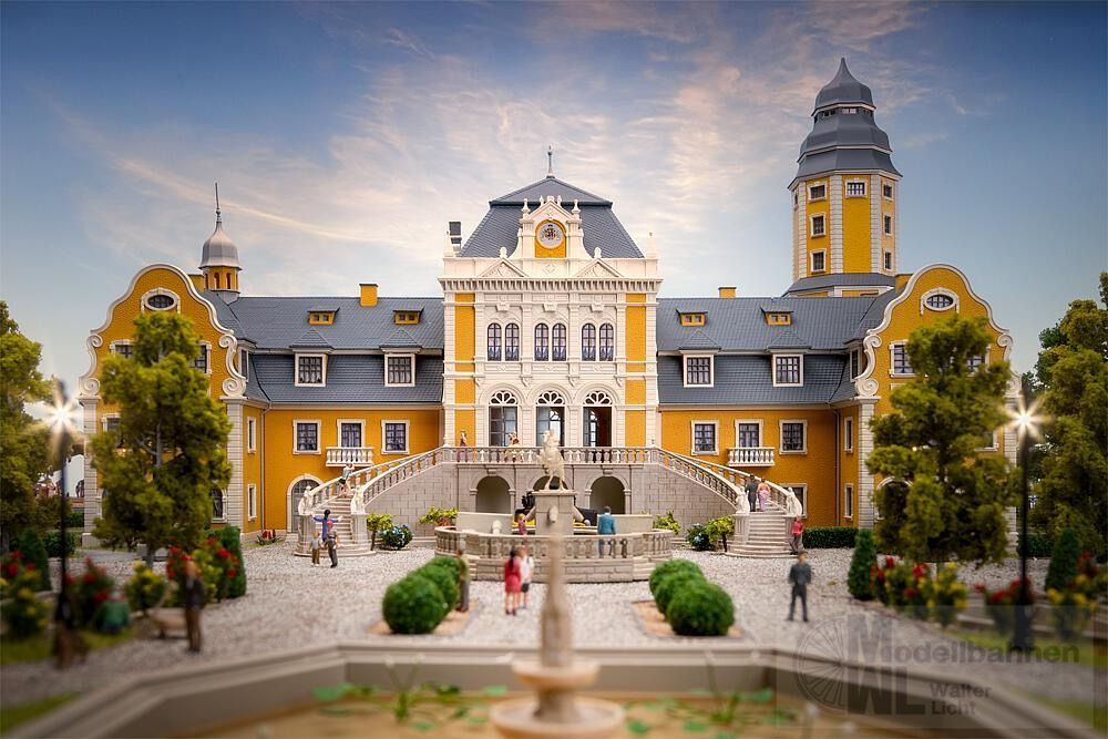 Dieses schöne Schlossmodell beeindruckt mit majestätischer Freitreppe, kunstvollen Verzierungen, markantem Turm und einer eleganten gelben Fassade. Inspiriert von barocken Residenzen des 17. und 18. Jahrhunderts verkörpert es die ganze Schönheit und Macht dieser Epoche. Die Barockzeit war geprägt von Macht und der kunstvollen Inszenierung von Gefühlen. Schlösser wie Versailles oder Ludwigsburg verkörpern bis heute diese Werte. Strenge Symmetrie, prachtvolle Architektur und überwältigende Raumwirkungen bestimmten das Bild jener Zeit. Dieses Modell greift diesen Geist auf und bringt ein Stück königlicher Baukunst auf die Modellanlage.