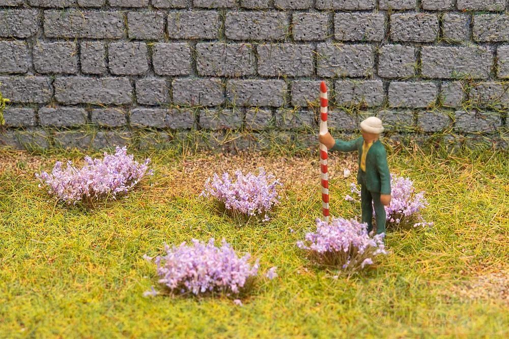 Kleine, unregelmäßige Blütenbüschel in Lila zum Aufkleben – perfekt, um Wege, Gärten, Parks oder Wiesen zu beleben und der Modelllandschaft eine natürliche, detailreiche Note zu verleihen.