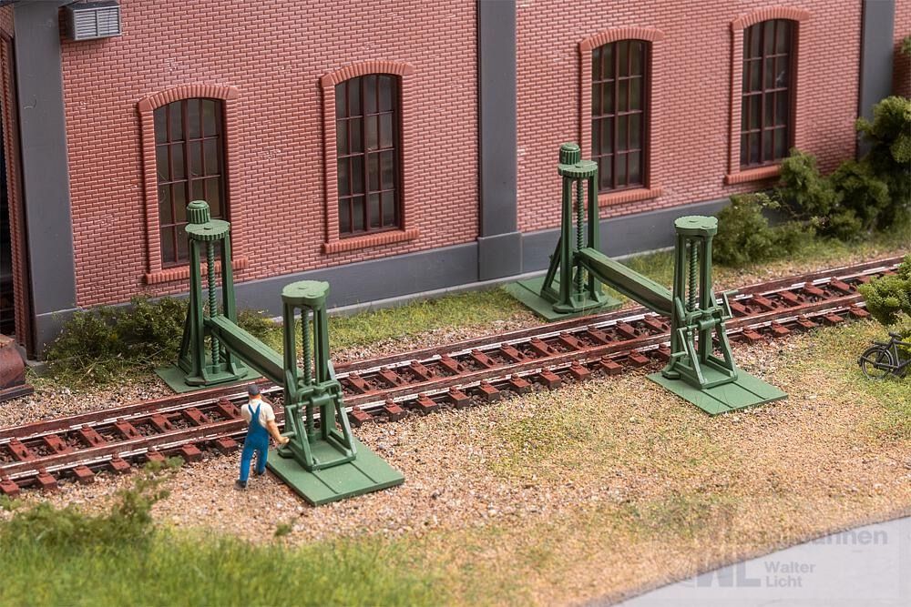 Mit diesen zwei Spindelhebeböcken lassen sich Waggons mühelos zum Warten aufbocken – so werden Reparaturen und Pflegearbeiten für die Miniaturarbeiter zum Kinderspiel!
