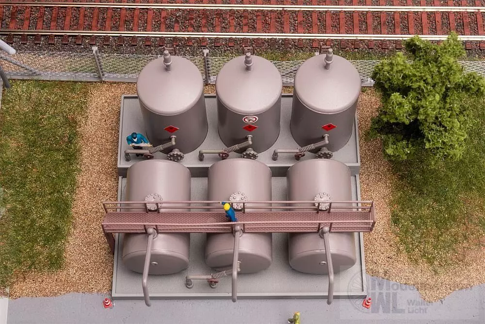 Oberirdisches Tanklager mit drei liegenden und drei stehenden Treibstofftanks. Robust gestaltet und detailgetreu umgesetzt, eignet es sich zur realistischen Ergänzung von Industrie- oder Hafenanlagen in Miniaturwelten.