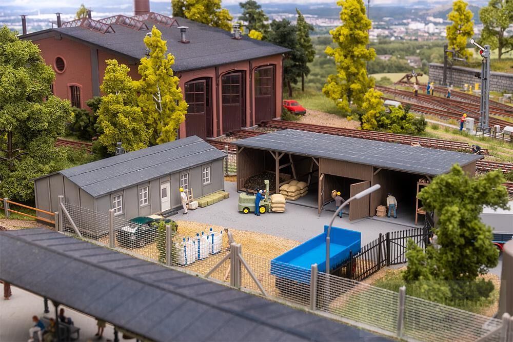 Dieses Set besteht aus einer grauen Baracke und einem hölzernen Kohleschuppen, ergänzt durch kleine Kohlesteinchen. Ideal, um Modellanlagen oder Dioramen um realistische Industrie-Details zu erweitern.