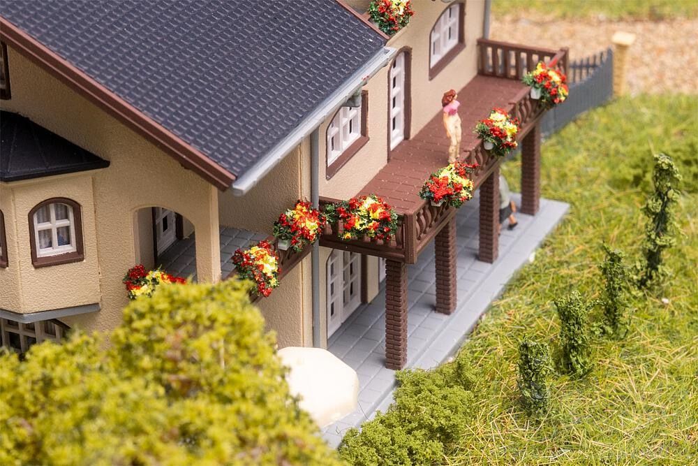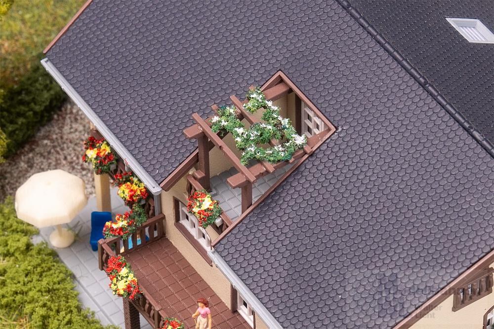 Das helle, moderne Wohnhaus mit Erker, Balkonen, überdachter Terrasse und innenliegendem Dachbalkon sowie bunten Blumenkästen bringt Ruhe und lebendige Details in jede Miniatur-Wohngegend.