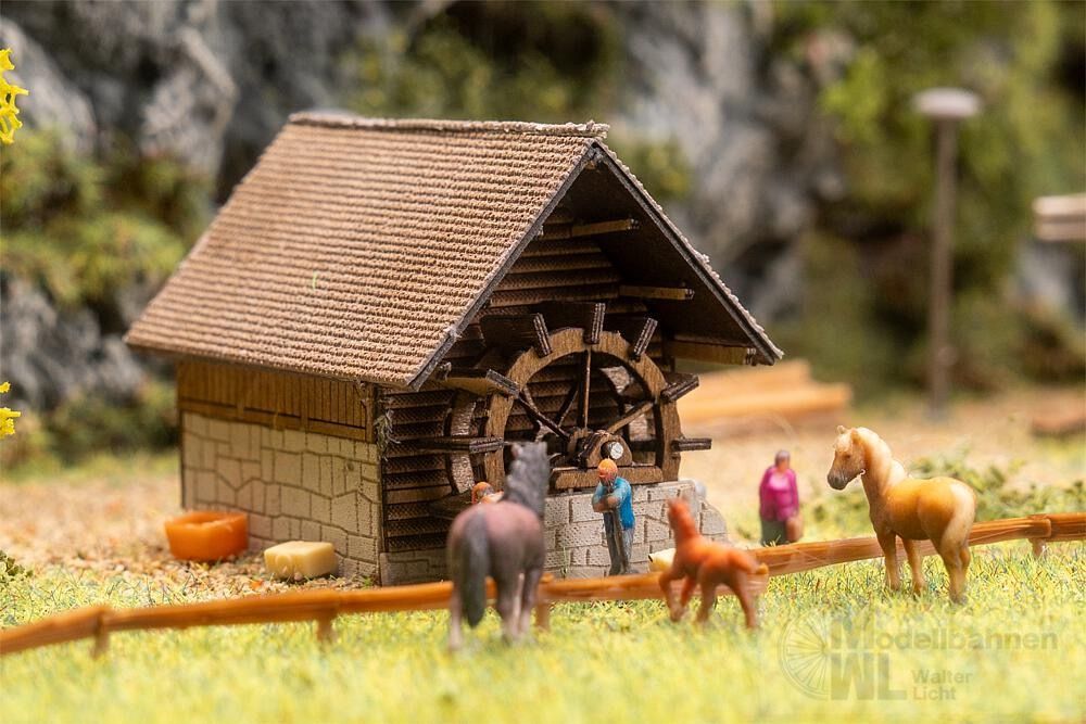 Rustikal und aus Holz gefertigt, vermittelt das Modell eines Sägewerks mit Wassermühle die typische Atmosphäre eines alten Handwerksbetriebs. Zahlreiche detailreiche Gerätschaften und Werkzeuge sorgen für authentischen Charme, während das Modell als liebevolles Detail ein Stück landschaftliches Idyll auf jede Miniaturanlage bringt.