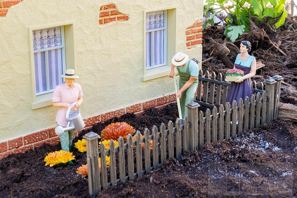 Arbeiten im Garten! Drei fleißige Hobbygärtner bei der Pflege ihrer grünen Oase! Ein Mann in Latzhose und Strohhut ist konzentriert bei der Arbeit mit dem Spaten – bereit, neue Beete anzulegen oder umzugraben. Eine Frau trägt stolz eine Kiste mit leuchtend roten Blumen, während ihre Kollegin mit Gießkanne und Gummistiefeln dafür sorgt, dass alles gut gedeiht. Mit liebevollen Details und sommerlicher Leichtigkeit bringen diese Figuren echtes Gartenleben auf jede Modellanlage – ideal zur Gestaltung von Vorgärten, Kleingartenanlagen oder Parkszenerien!
