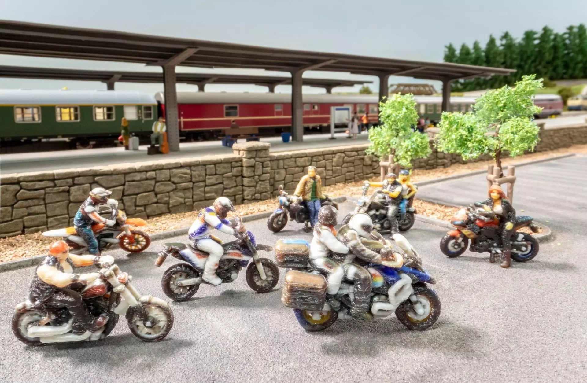 Mit dem NOCH "Tourenmotorrad fahrend mit Sozia" holen Sie sich eine Szene auf Ihre Modellwelt, die sofort nach Aufbruch und Abenteuer aussieht. Auf dem Motorrad sitzen zwei Fahrer in kompletter Schutzkleidung und Helm - eng beieinander, konzentriert nach vorn gerichtet. Hinten ist Reisegepäck verstaut, als würde die Tour gerade erst beginnen. Genau solche kleinen Augenblicke machen Ihre Anlage lebendig: Szenen aus dem echten Leben, die man sofort versteht - ohne viele Worte.