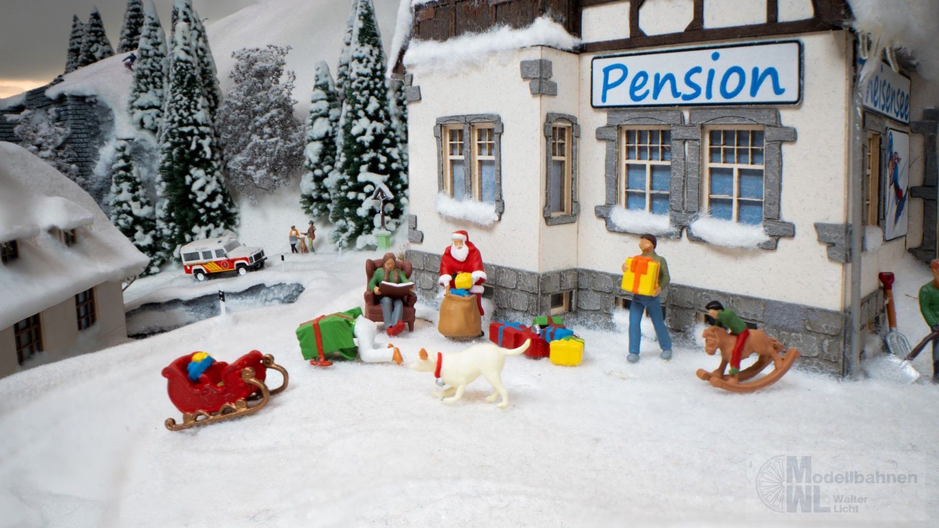 Mit der Figuren-Themenwelt „Weihnachten" holen Sie sich eine Szene auf Ihre Modellwelt, die sofort nach Lichterglanz, Vorfreude und echten Momenten voller Wärme aussieht. Geschenke liegen bereit, ein Schlitten steht gepackt, und der Weihnachtsmann ist mitten im Geschehen – als würde er gerade die nächsten Überraschungen verteilen. Dazu kommen liebevolle Details, die den Zauber des Festes spürbar machen: ein Schaukelpferd als klassisches Spielzeug, eine gemütliche Figur im Sessel und weitere kleine Elemente, die nach Zuhause und Geborgenheit wirken. Genau solche kleinen Augenblicke machen Ihre Anlage lebendig: Szenen aus dem echten Leben, die man sofort versteht – ohne viele Worte.