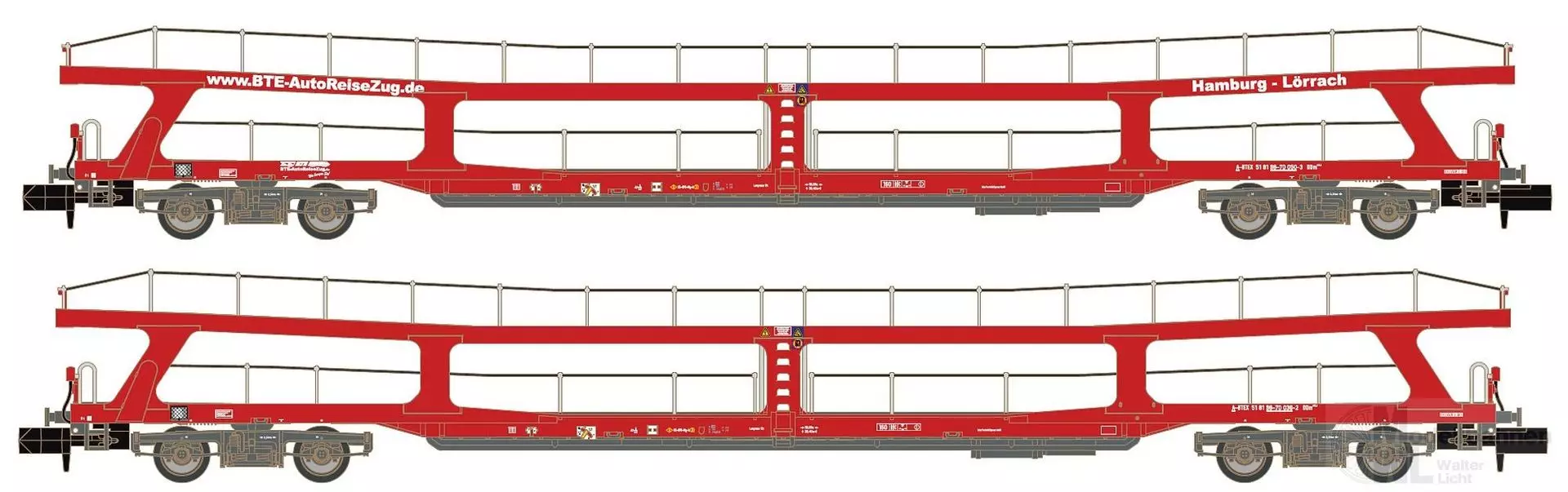 Passend zum Urlaubs-Express-Set Art.-Nr. LS2503N Epoche: VI Car trains have a long tradition in Germany – in 1956, Deutsche Bundesbahn launched the first car train from Hamburg to Chiasso. By 1988, Deutsche Bundesbahn's car train service already comprised 2,929 car trains and 484 D trains with car transport. In 2017, ÖBB took over car train services from Deutsche Bahn AG and integrated them into its Nightjet night train division. Four-axle DDm915 car transport wagons purchased in the 1970s are used for this service. The wagons were initially manufactured by Waggonbau Graff and later by Waggonfabrik Uerdingen. In 1971, Austrian Federal Railways purchased ten DDm98-80 cars from Waggonfabrik Uerdingen, which are very similar to the DDm915 cars used by DB. Between 1982 and 1990, eighty further developed DDm98-70 cars were built at Jenbacher Werke. Hobbytrain produces both the DDm915 and the DDm98-70 with all design differences as detailed models for N gauge.