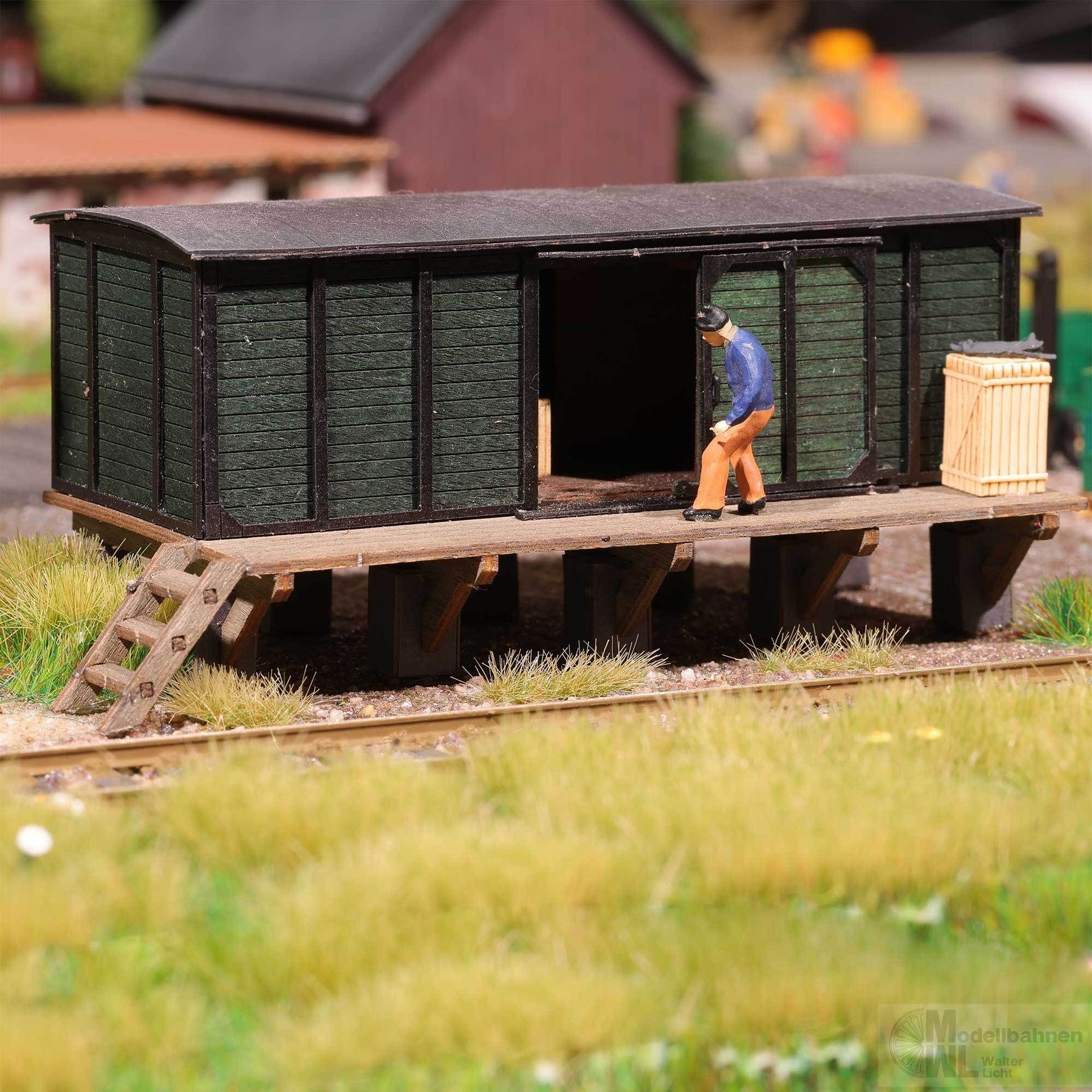 Ein zweites Leben erhält dieser ausrangierte Güterwaggon als Behelfsschuppen! Vielseitig einsetzbar in Gärten, Hinterhöfen, in Hafenszenen oder auch auf einem Bahngelände. Die Beplankung der Wände ist originalgetreu in echtem Holz ausgeführt. An den Längsseiten des Schuppens befinden sich Holzschiebetore, die in geöffnetem und geschlossenem Zustand montierbar sind. Die Rampe hat einen seitlichen Treppenaufgang. Bausatz.