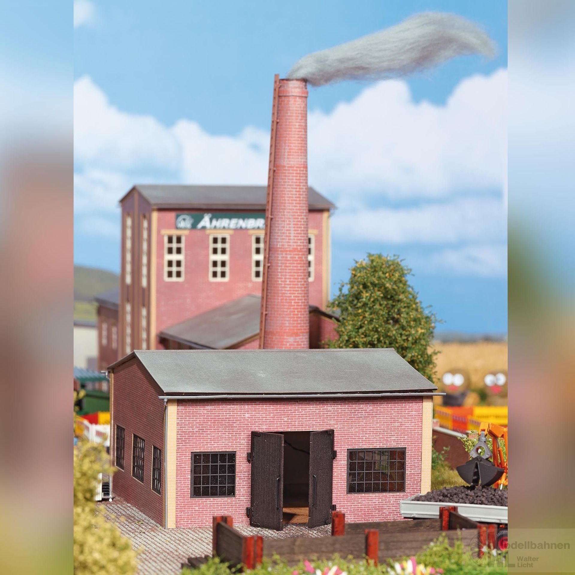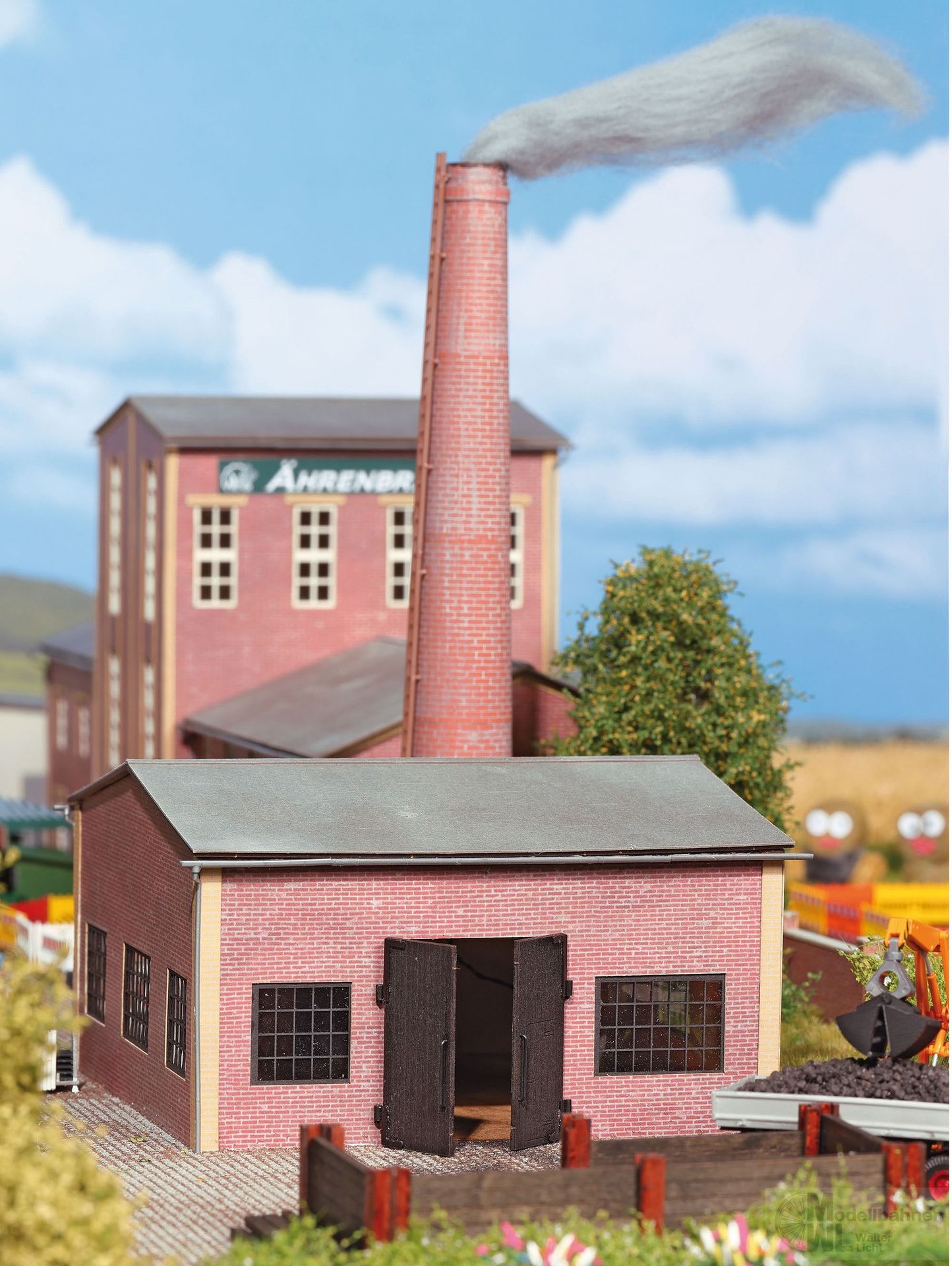 Das Heizhaus versorgt umliegende Gebäude mit Wärme, die aus Kohle, Gas, Heizöl usw. gewonnen wird. Dieses Modell fügt sich flexibel in Fabrik- und Industrieanlagen ein, denn die Fassade ist in typischer Ziegelbauweise gestaltet. Mit großen Gitterfenstern auf allen Seiten. Im großen Holztor aus echtem Holz ist eine kleine Durchgangstür eingearbeitet. Mit imposantem Schornstein und filigranen Regenrinnen und Fallrohren aus Kunststoff. Bausatz. Beleuchtbar mit Busch LEDs 5998. Stilistisch passende Ergänzung ist das imposante Produktionsgebäude Nr. 1973.