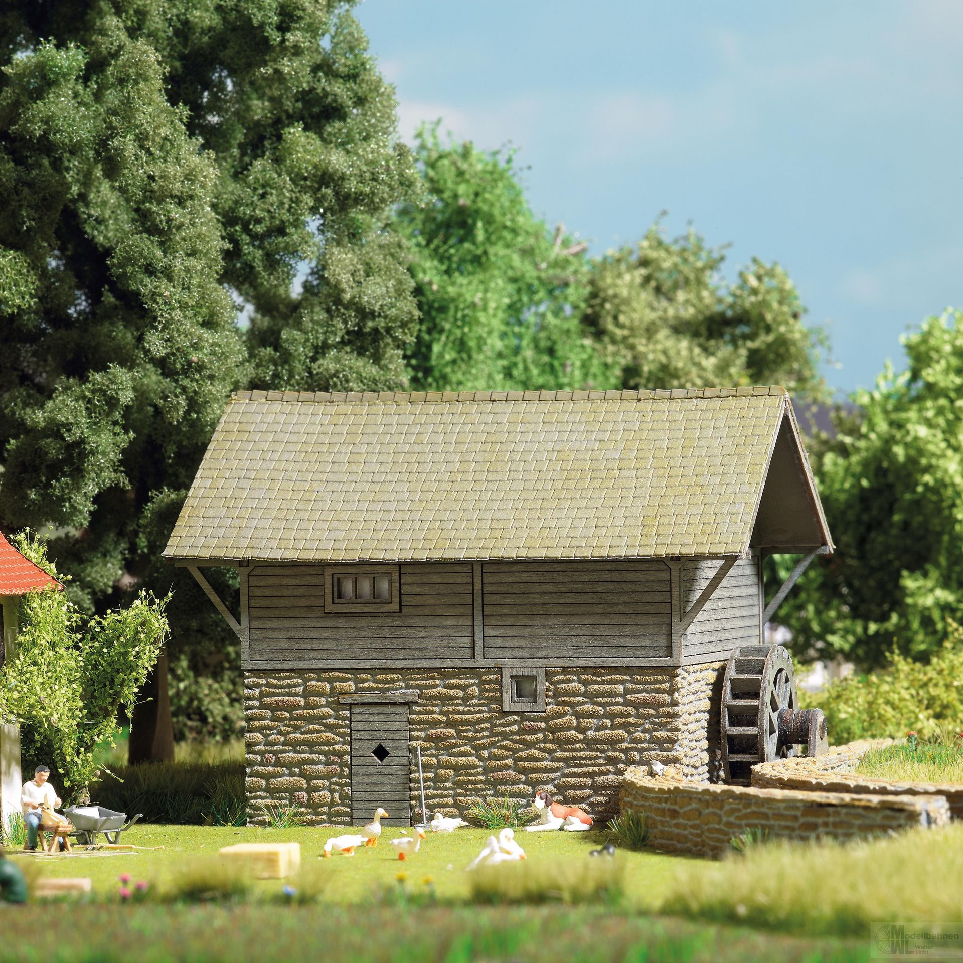 »Es klappert die Mühle...« Bausatz einer Wassermühle mit Mühlrad, Gebäudefassade in Steinoptik und aus echtem Holz. Die Mühle kann mit dem Faller®-Bastelmotor Nr. 180629 zum Funktionsmodell erweitert werden.
