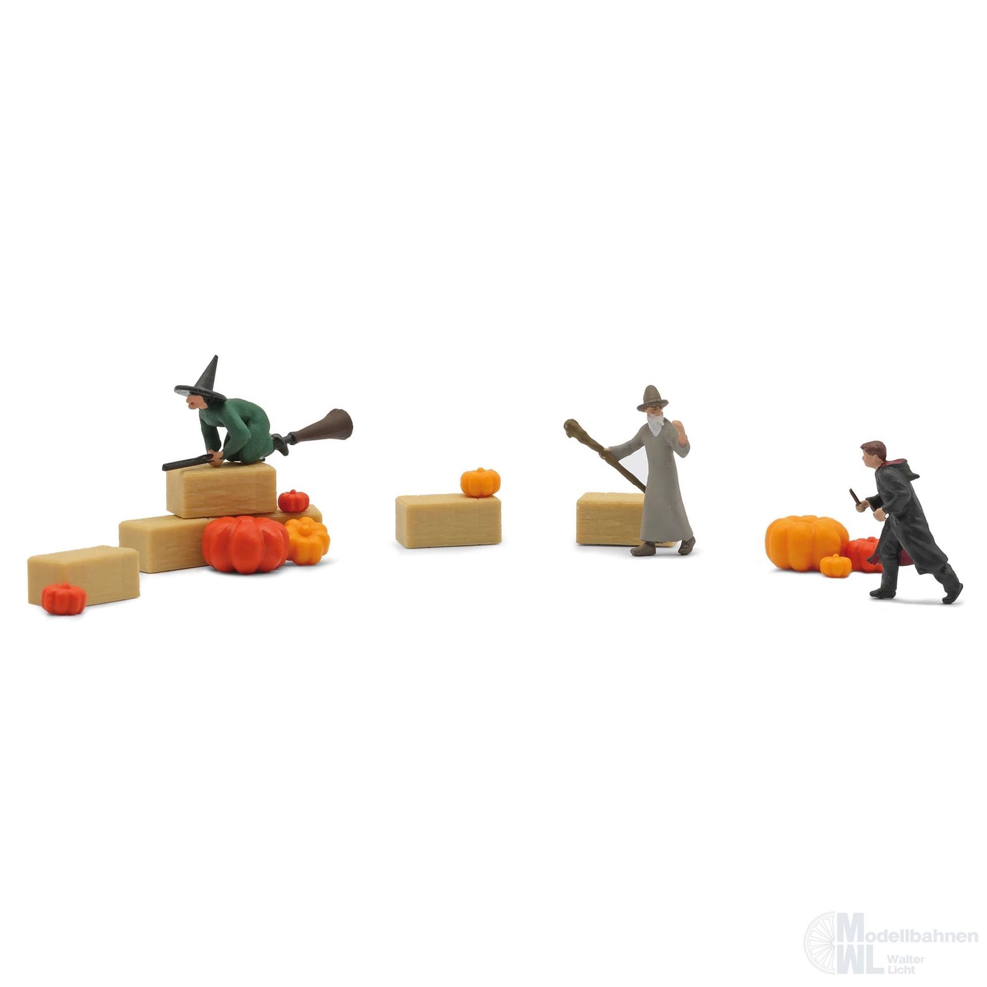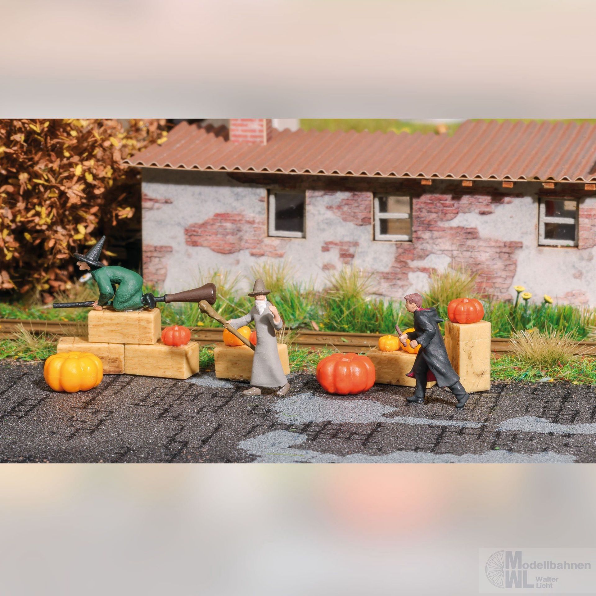 Halloween wird auch im Maßstab 1:87 gefeiert! Hier jagen zwei verkleidete Kinder einer Hexe auf ihrem fliegenden Besen hinterher. Zur Ausgestaltung in diesem Action Set gehören selbstverständlich auch Heuballen und bunte Kürbisse. Stimmungsvolle Ergänzung: Leuchtkürbis Nr. 5417.