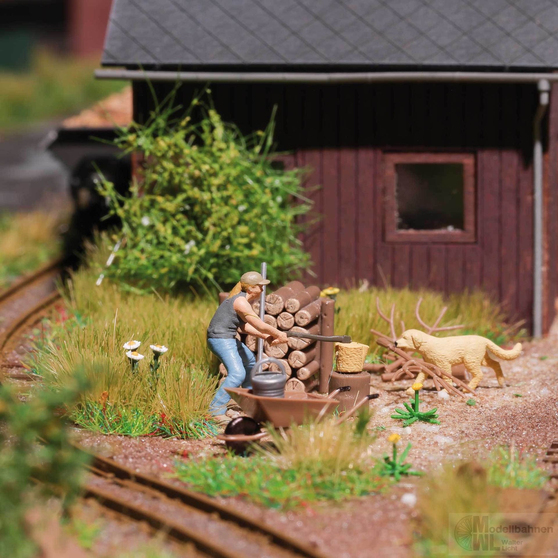 Kraftvoll spaltet die junge Frau die Holzscheite am Hackstock. Für Ordnung sorgt ihr Hund, der die umliegenden Äste brav aufsammelt. Im Action Set sind außerdem ein Holzstapel, Schubkarren und Werkzeug für einen lebendigen Szenenaufbau enthalten.