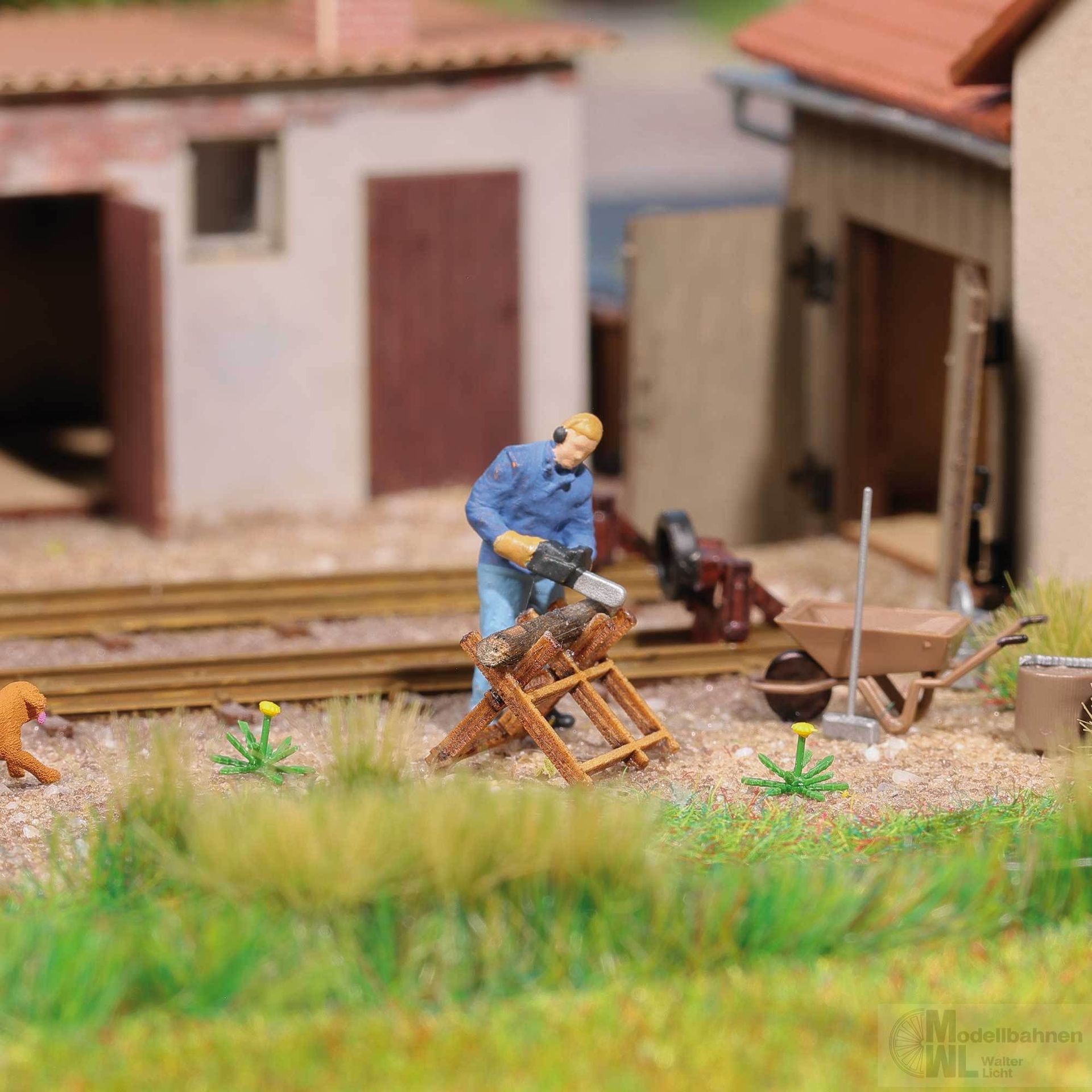 Ein Mann steht konzentriert am Sägebock und führt seine Motorsäge durch einen Holzstamm. Die »Micky Mäuse« schützen ihn vor dem Lärm. Rund um ihn arrangiert befinden sich mehrere Baumstümpfe sowie nützliches Arbeitsmaterial wie ein Schubkarren, Besen, Eimer und verschiedenes Werkzeug.