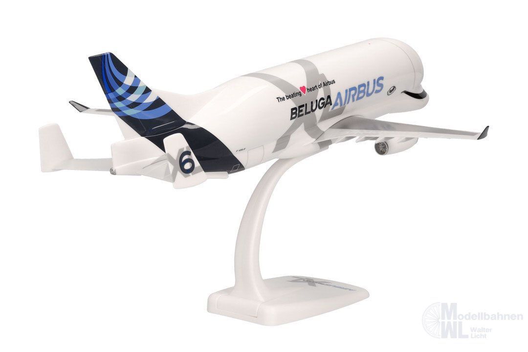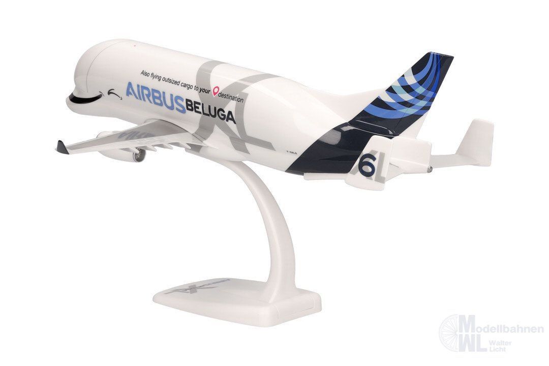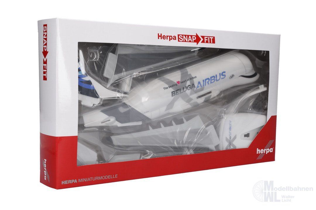 Die aus der A330 entwickelte Beluga XL verfügt über eine um 30 Prozent höhere Frachtkapazität als ihre Vorgängerin A300-600ST und ermöglicht beispielsweise den Transport von zwei Tragflächen der A350 statt nur einer, wie es bei der bisherigen Beluga möglich war. Äußerlich am leichtesten erkennbar ist die XL an ihrem Lächeln, das die Optik des Wals noch verstärkt. Am 21. Juli 2023 startete die sechste und letzte BelugaXL in Toulouse zu ihrem Erstflug. Im Unterschied zu den ersten fünf zwinkert Beluga Nummer Sechs noch auf der Backbord-Seite. SnapFit-Modelle von Herpa überzeugen mit einem unschlagbaren Preis-/Leistungsverhältnis. Sie werden mit einem Display-Stand geliefert und sind mit wenigen Handgriffen ohne Kleber oder sonstigen Werkzeugen zusammengebaut.
