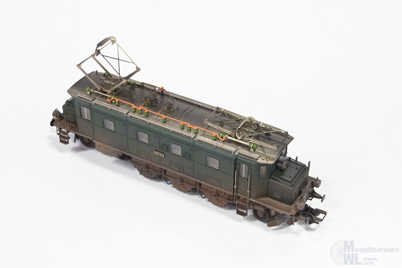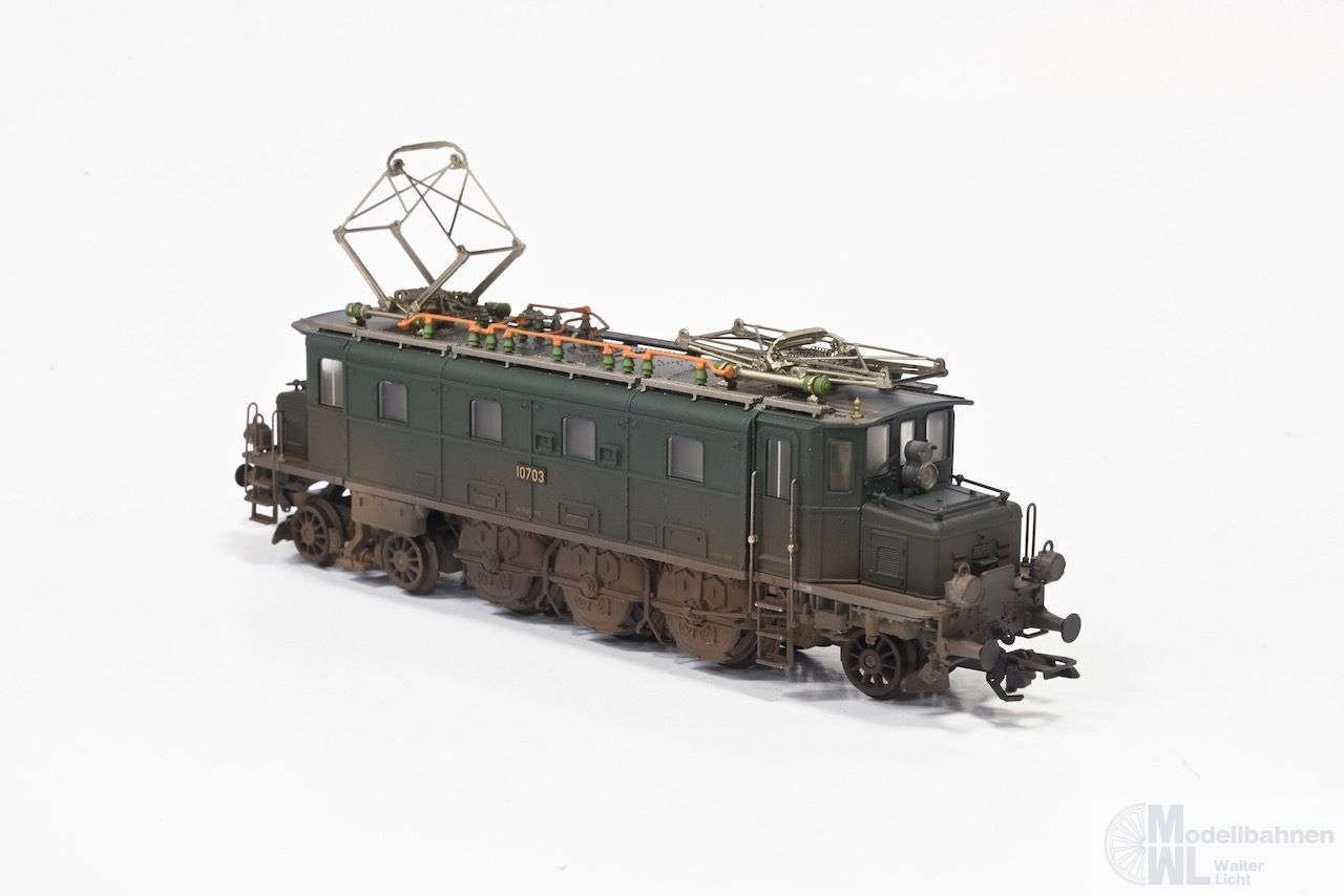 Vorbild: Elektrolokomotive Ae 3/6 I der SBB. Lokomotive aus dem achten Baulos. Gealterte, exklusive und stark limitierte Sonderausführung mit Stangenpuffer, stirnseitigen Übergangsblechen und 4 seitlichen Führerstandstüren. Falschfahrsignal über der jeweils oberen Lampe. Lokomotive für den Einsatz vor Leichtschnellzügen im Flachland auf der Strecke Genf-Bern-Zürich. Lok-Betriebsnummer 10703. Betriebszustand Anfang der 1950er Jahre.