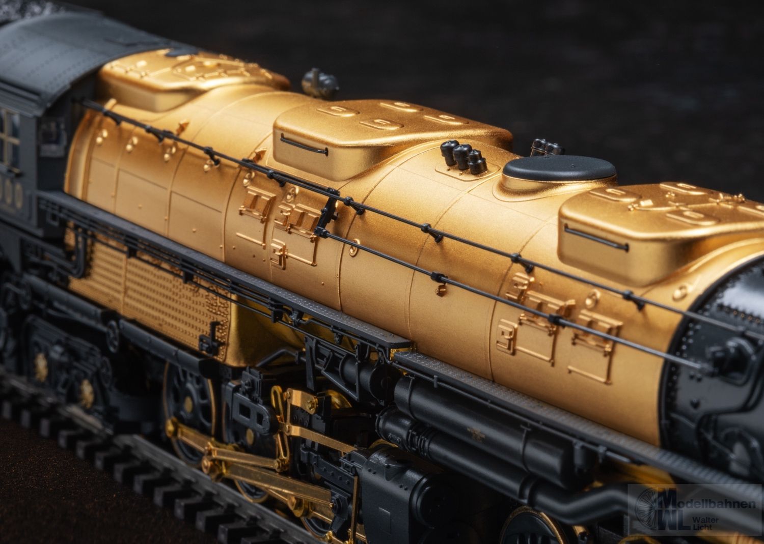 Modell: Rauchkammertür, Kesseloberteil, Tenderkasten, Treibradsätze, Laufradsätze, Gestängeteile sowie diverse Ansetzteile aus Metall und mit 24 Karat Feingold beschichtet. Mit Digital-Decoder mfx+ und umfangreichen Geräuschfunktionen. Geregelter Hochleistungsantrieb. 2 Achsen angetrieben, 6 Achsen über Kuppelstange angetrieben. Haftreifen. Kurvengängiges Gelenkfahrwerk. Boxpok-Räder. Mittlere Kuppelachsen gefedert. Stirnlampe, Tender und Nummerntafeln mit wartungsfreien warmweißen Leuchtdioden (LED) beleuchtet. 2 Rauchsätze (7226) nachrüstbar, Kontakte ständig betriebsbereit. Spitzensignal- und Nummerntafelbeleuchtung konventionell in Betrieb, digital schaltbar. Führerstandbeleuchtung digital schaltbar. Stirnseitig Kupplungshaken im Schienenräumer einsteckbar. Kurzkupplung zwischen Lok und Tender. Dampfleitungen schwenkbar mit den Zylindern geführt. Angesetzte Griffstangen aus Metall. Viele angesetzte Einzelheiten. Lokführerfigur und Heizerfigur für den Führerstand liegen bei.Der "Big Boy" wird in einer exklusiven Verpackung mit Echtheitszertifikat ausgeliefert. Lokomotive und Echtheitszertifikat sind durchnummeriert. Ein Paar weiße Baumwoll-Handschuhe sowie ein Booklet über die Entstehung des Modells liegen bei. Zusätzlich liegt ein mit 24 Karat Feingold beschichteter Schleifer bei, zum Austausch gegen den serienmäßig montierten Fahrschleifer.Länge über Kupplungen ca. 46,5 cm.