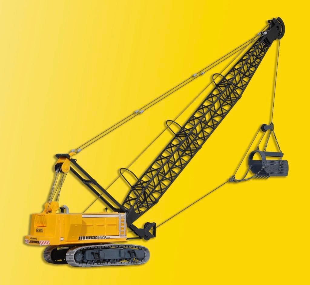 Bausatz. Vorbilddaten: LIEBHERR Seilbagger HS 883 HD Litronic, Motorleistung 448 kW/609 PS, Einsatzgewicht ca. 110 t, Auslegerlänge bis 74 m, max. Traglast 120 t. Maße: L 35,5 x B 5,5 x H 11 – 29 cm. Schwierigkeitsgrad: 3 (Profis).